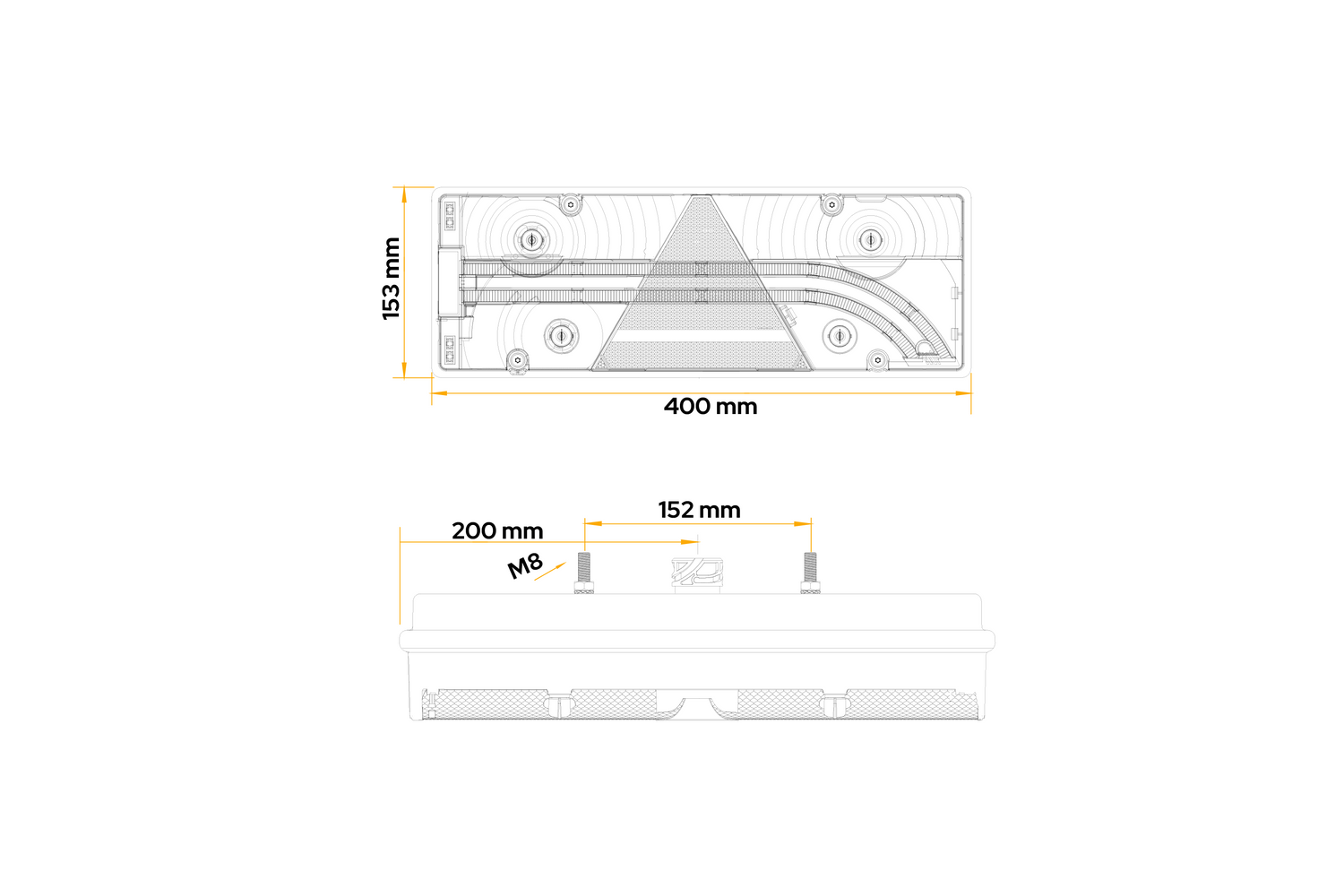 Die Europoint III Rückleuchte von ASPÖCK ist für den Einbau auf der linken Fahrzeugseite vorgesehen und hat folgende Abmessungen: Breite 400 mm, Höhe 153 mm, Tiefe 88 mm. Ausgestattet mit einem 7-poligen ASS2.1-Anschluss ermöglicht es eine einfache und schnelle Installation in Anhängern, Bussen und Abschleppwagen.