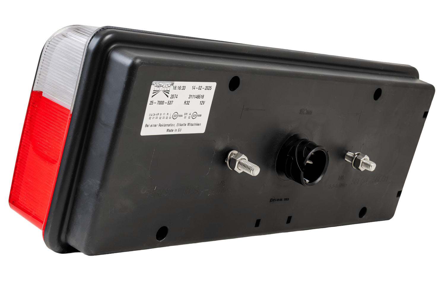 Die IP56K- Rückleuchte ist äußerst widerstandsfähig gegen äußere Einflüsse und eignet sich daher perfekt für anspruchsvolle Arbeitsumgebungen. Die IP56K-Klasse bedeutet, dass die Lampe vor Staub in Mengen geschützt ist, die ihren Betrieb beeinträchtigen könnten, und dass sie vor starken Hochdruckwasserstrahlen aus allen Richtungen geschützt ist. Dieses Design macht es ideal für den Einsatz in Fahrzeugen und Maschinen, die unter schwierigen Bedingungen arbeiten, wie z. B. auf Baustellen, in Industriegebieten oder im Straßenverkehr, und gewährleistet eine zuverlässige Beleuchtung und Langlebigkeit.