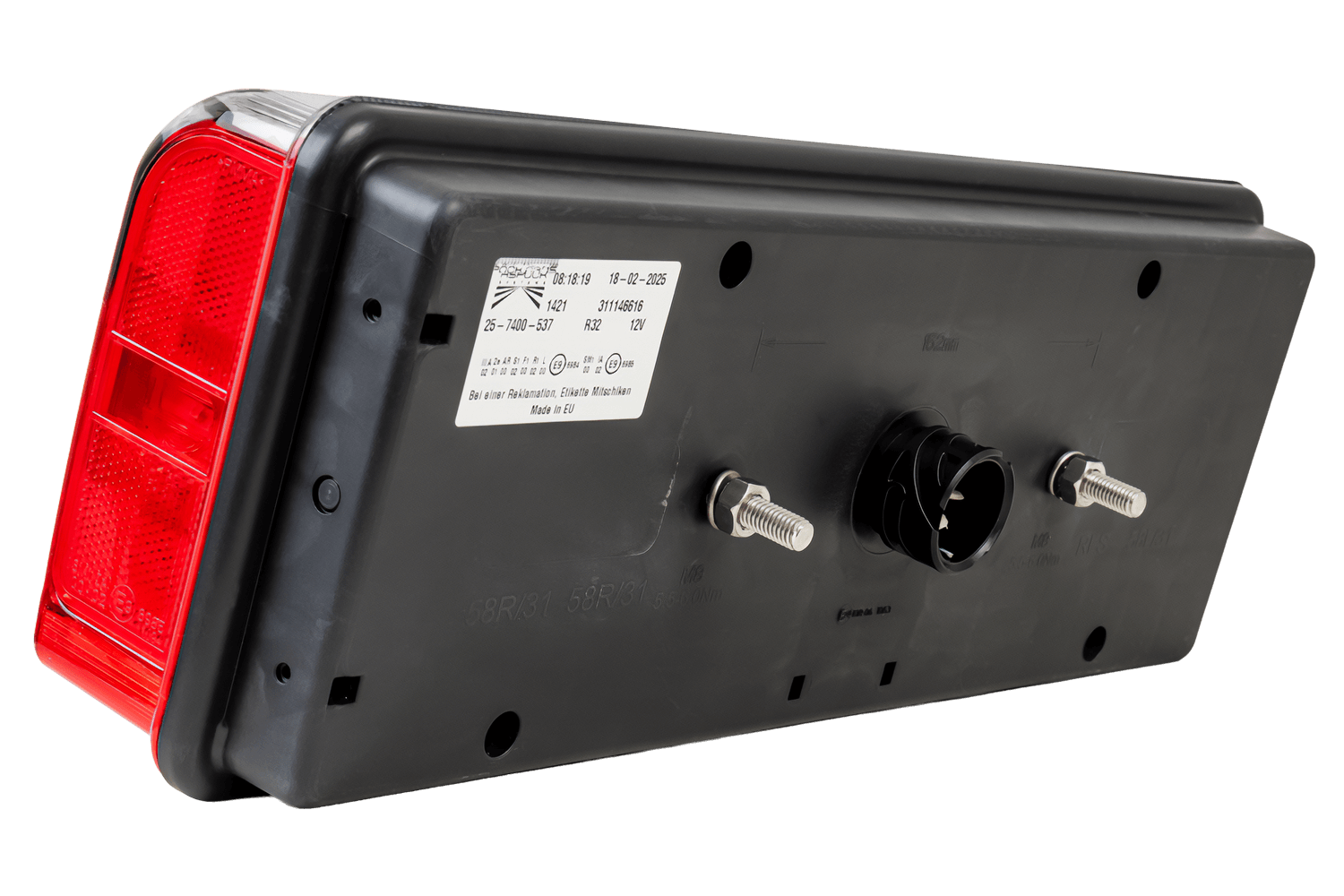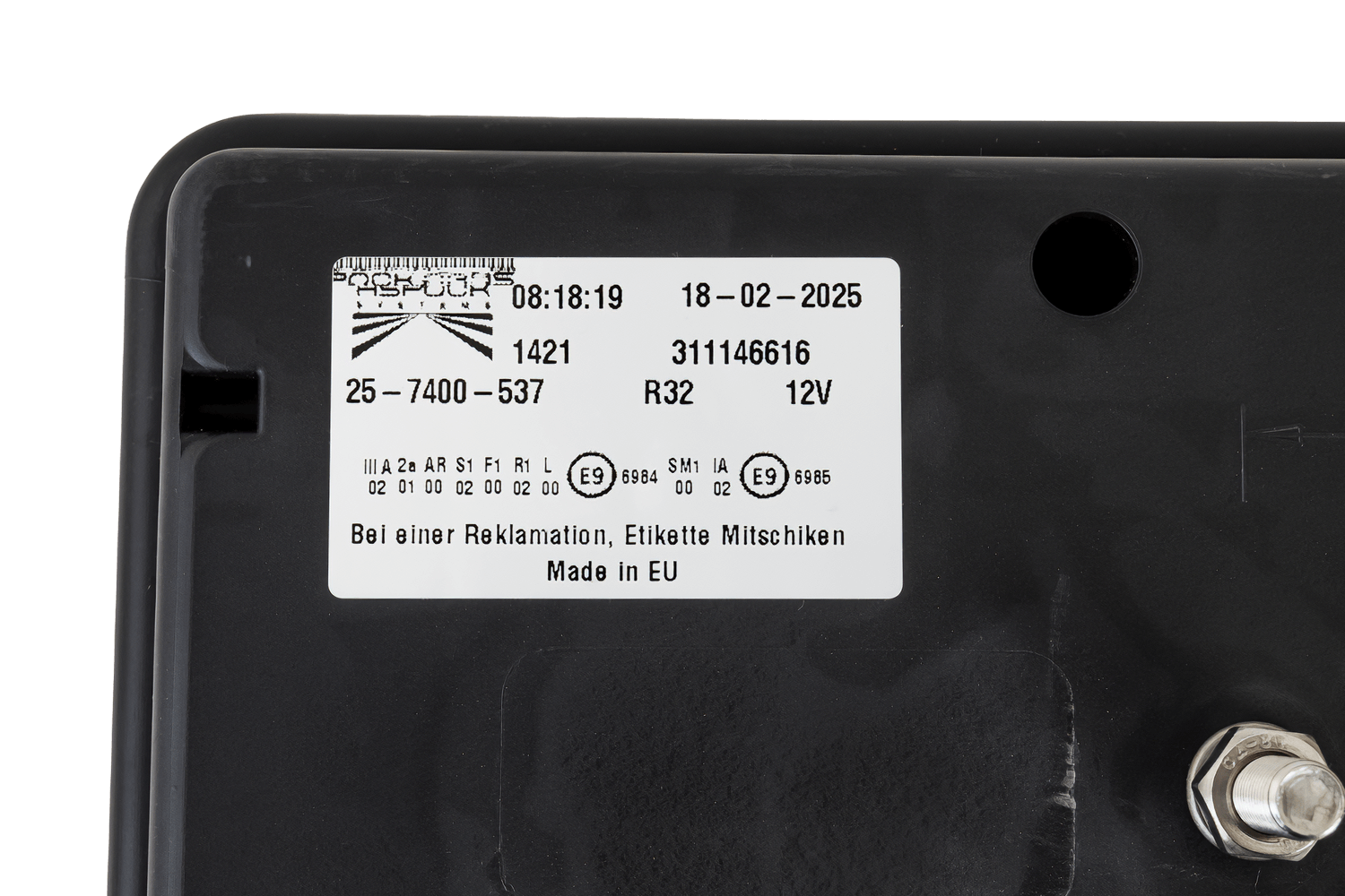 SeitenmarkierungslichtDie Lampe hat sieben Funktionen: Positionslicht, das die Sichtbarkeit des Fahrzeugs bei Nachtfahrten gewährleistet; ein Blinker, der die Anzeige der Abbiegeabsicht ermöglicht; Bremslicht, signalisiert Bremsen; Rückfahrlicht, das Rückwärtsmanöver erleichtert, indem es die Sicht hinter dem Fahrzeug verbessert; Nebelscheinwerfer, der die Sicherheit bei schwierigen Wetterbedingungen wie Nebel oder starkem Regen erhöht; ein reflektierendes Dreieck, das die Sichtbarkeit des Fahrzeugs erhöht; und ein Seitenmarkierungslicht, das die Außenkonturen des Fahrzeugs hervorhebt und so seine Sichtbarkeit auf der Straße, insbesondere bei Nacht und schlechten Lichtverhältnissen, verbessert. Die Lampe verfügt über die Dichtheitsklasse IP56K, die E9-Zulassung und Einhaltung der ADR-Zone 2 -Standards.