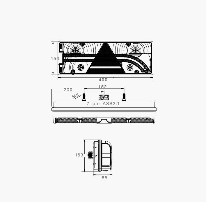 Ein Satz aus zwei EUROPOINT III- Rückleuchten von ASPÖCK, vorgesehen für den Einbau auf der linken und rechten Fahrzeugseite, mit den folgenden Abmessungen: Breite 400 mm, Höhe 153 mm, Tiefe 88 mm. Beide Lampen sind mit ASS2.1 7-Pin-Anschlüssen ausgestattet, was eine einfache und schnelle Installation in Anhängern, Bussen oder Abschleppwagen ermöglicht.