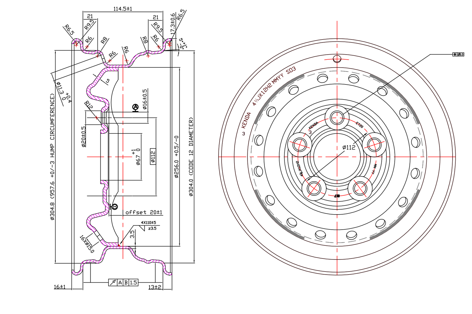 Verstärkte Stahlfelge für KENDA-Anhänger 4,5Jx12"H2 5x112 ET:20