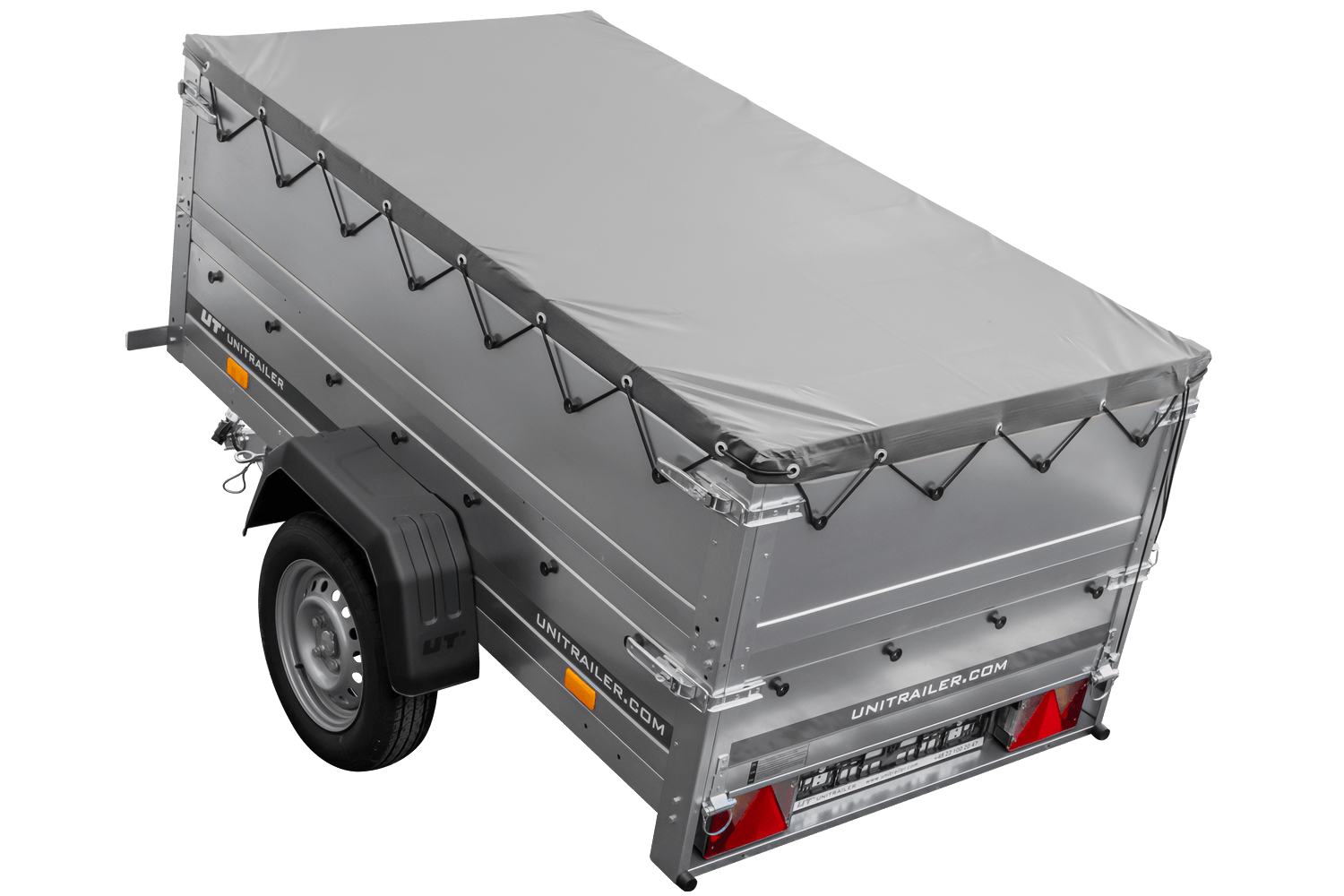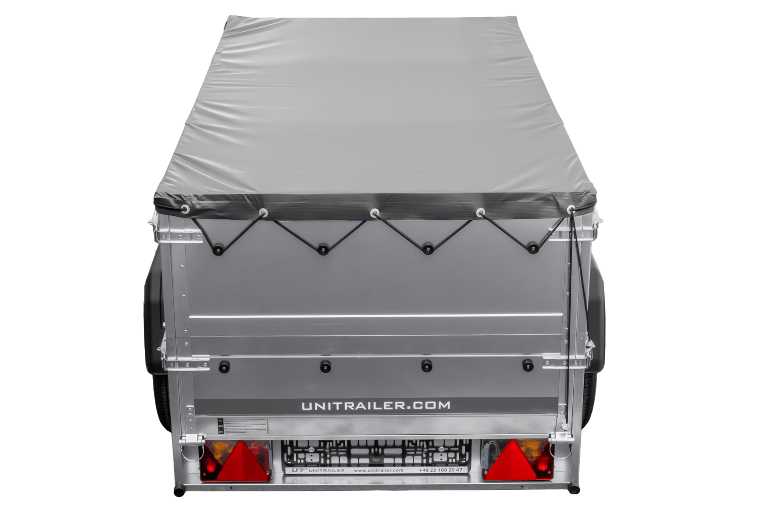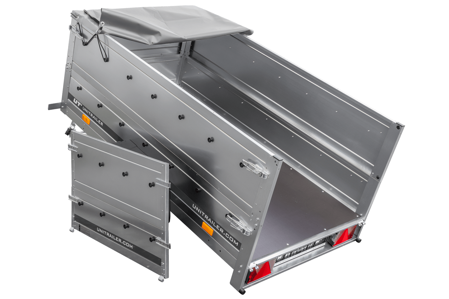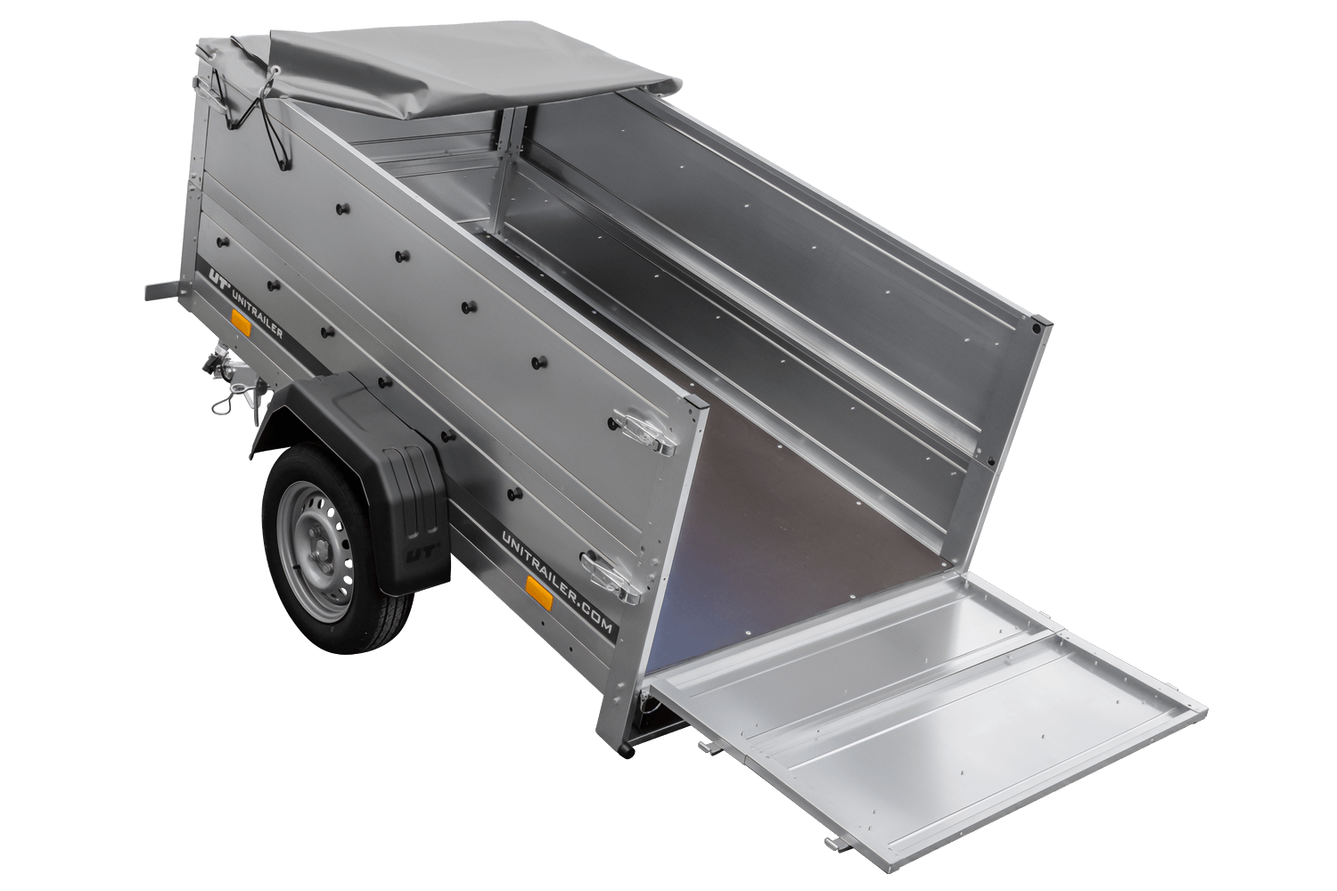 Kippbarer Pkw Anhänger 750 kg UNITRAILER Garden Trailer 200 KIPP mit zusätzlichen Bordwänden, Stützrad und Flachplane
