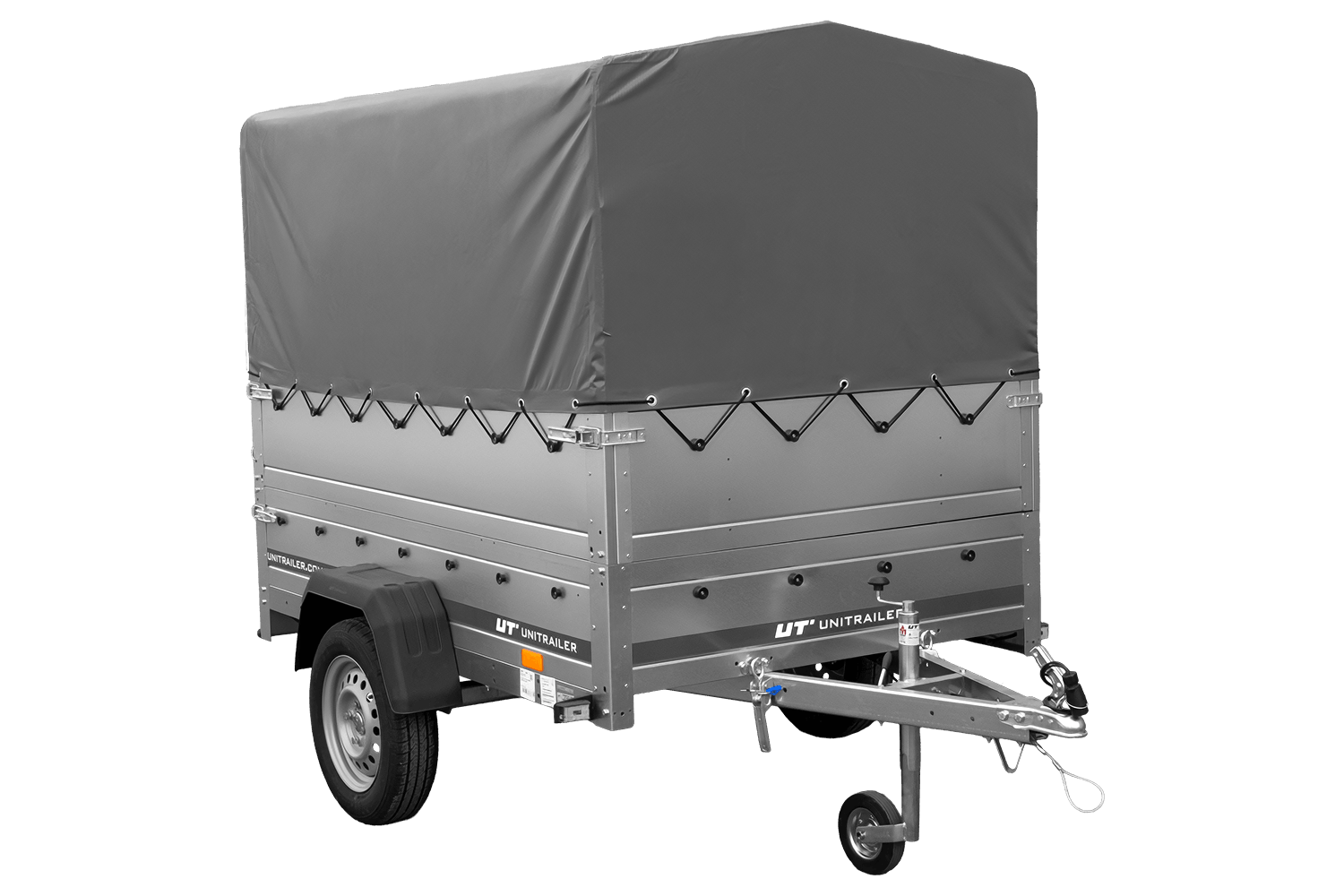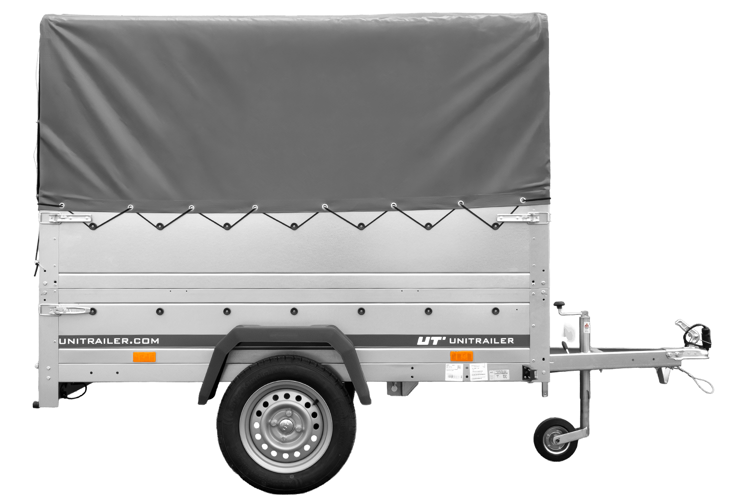 Autotransportanhänger 200x125 UNITRAILER GARDEN 201 KIPP mit BIS-Seitenwänden, H-800-Rahmen und grauer Plane