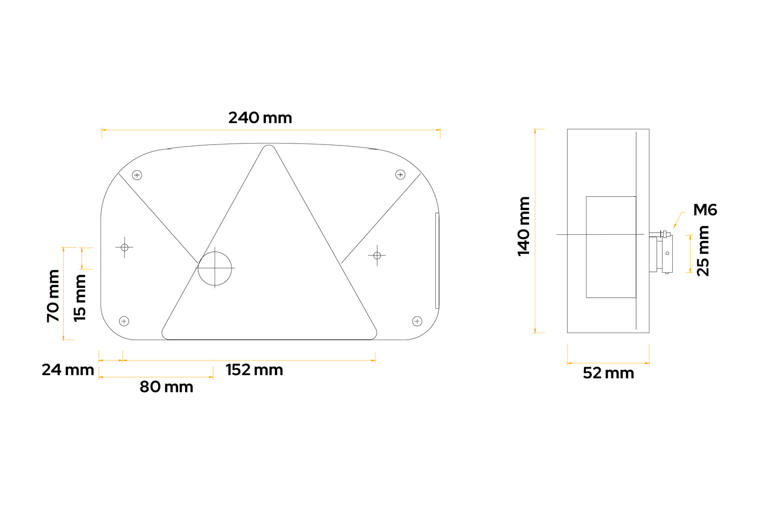 Die Multipoint II Rückleuchte von ASPÖCK ist für den Einbau auf der rechten Fahrzeugseite vorgesehen und hat folgende Maße: Breite 240 mm, Höhe 140 mm, Tiefe 52 mm. Ausgestattet mit einem 5-poligen Bajonettanschluss ermöglicht es eine einfache und schnelle Installation in Anhängern, Bussen und Abschleppwagen .