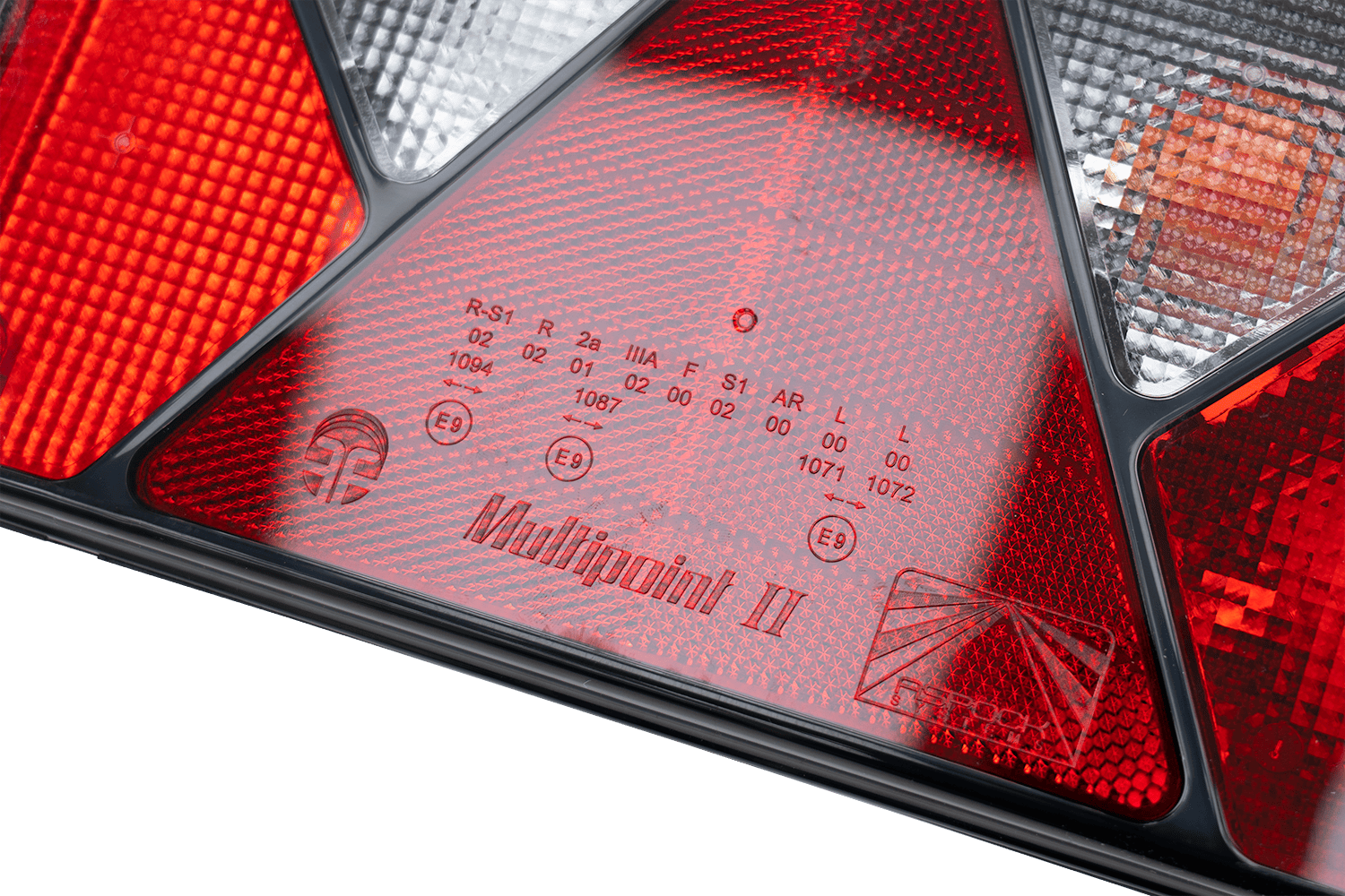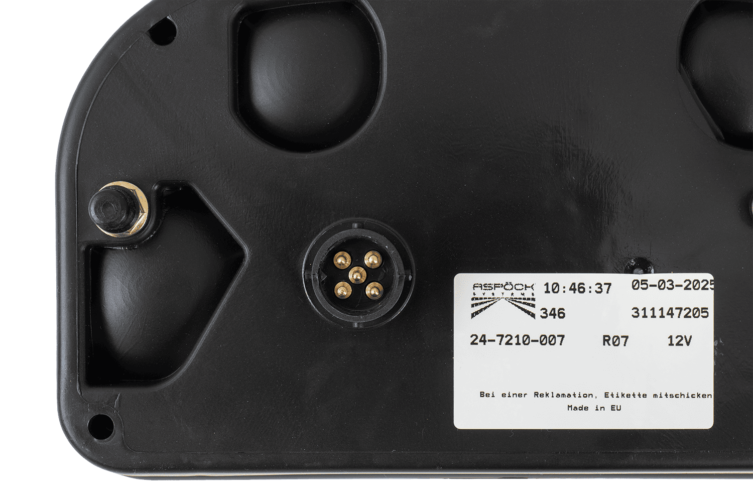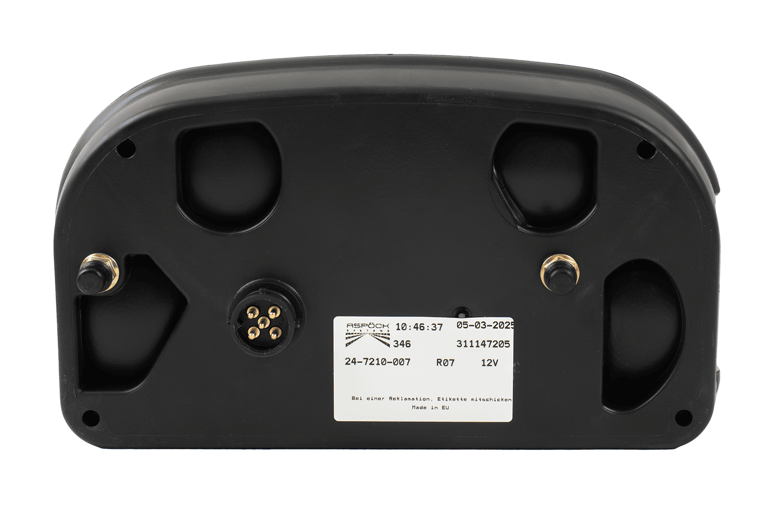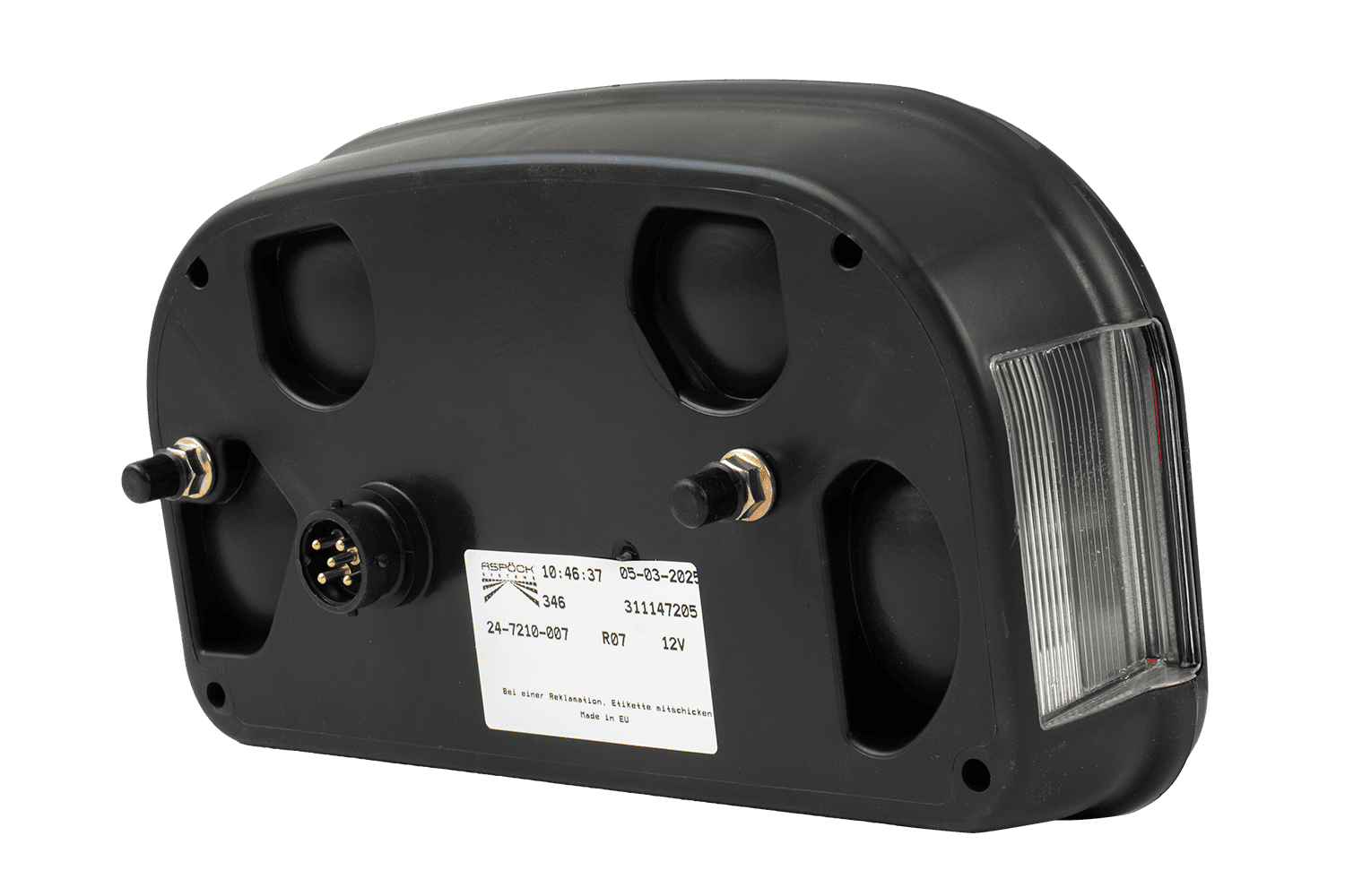 - Multipoint II ASPÖCK Rückleuchte zur Montage auf der rechten Seite. Es bietet sechs Funktionen: Positionslicht, Bremslicht, Rückfahrlicht, Kennzeichenbeleuchtung, Blinker und Reflektor.