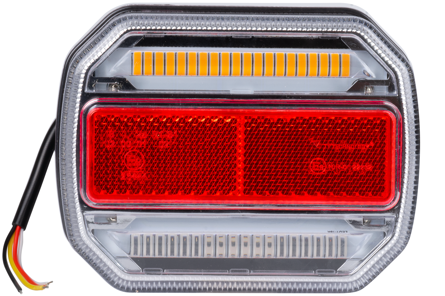 Die Heckleuchte mit E9- Zulassung und Konformität mit den Vorschriften ECE R3, R4, R6, R7, R10, CE, ROHS und UKCA erfüllt die europäischen Anforderungen an die Sicherheit und Qualität der Fahrzeugbeleuchtung. ECE R3 zertifiziert die Wirksamkeit von Reflektoren und stellt ihre Sichtbarkeit bei Nacht sicher. ECE R4 weist auf eine ausreichende Kennzeichenbeleuchtung hin. ECE R6 legt Anforderungen an Fahrtrichtungsanzeiger fest und stellt deren Sichtbarkeit und korrekte Funktion sicher. Die ECE R7 regelt die Normen für Positions- und Bremslichter und sorgt so für Sicherheit im Straßenverkehr. ECE R10 bestätigt die elektromagnetische Verträglichkeit und schließt Störungen der elektronischen Geräte im Fahrzeug aus. CE- , ROHS- und UKCA- Zertifikate garantieren zusätzlich die Einhaltung ökologischer und sicherheitstechnischer Anforderungen auf dem europäischen und britischen Markt. Diese Lampe ist ideal für den Einsatz in Nutzfahrzeugen, Anhängern, Sattelaufliegern und Landmaschinen.