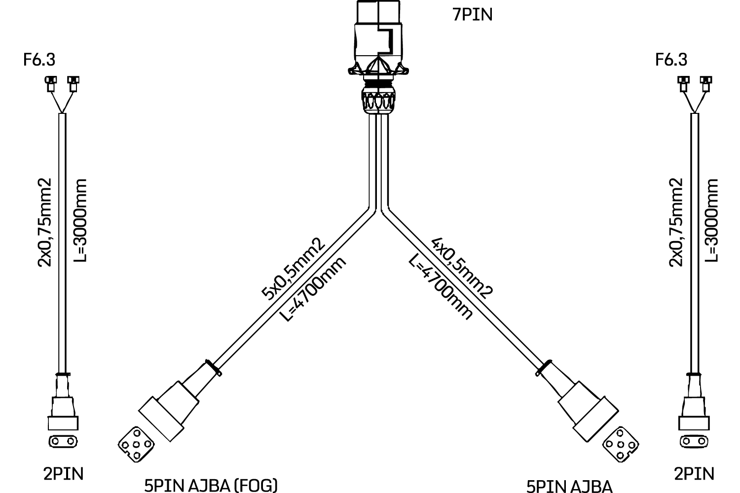 Der Kabelbaum ist mit zwei AJ.BA 5 PIN Bajonettsteckern und zwei AJ.BA 2 PIN Bajonettsteckern zum Anschluss der Rücklichter ausgestattet. Das Bajonettsystem gewährleistet eine schnelle und sichere Montage und schließt die Gefahr einer unbeabsichtigten Trennung während der Fahrt aus. Die Konstruktion der Steckverbinder gewährleistet eine wasserdichte Verbindung und schützt die Kontakte vor Korrosion, was einen langfristigen, störungsfreien Betrieb der gesamten Anhängerbeleuchtungsanlage gewährleistet.