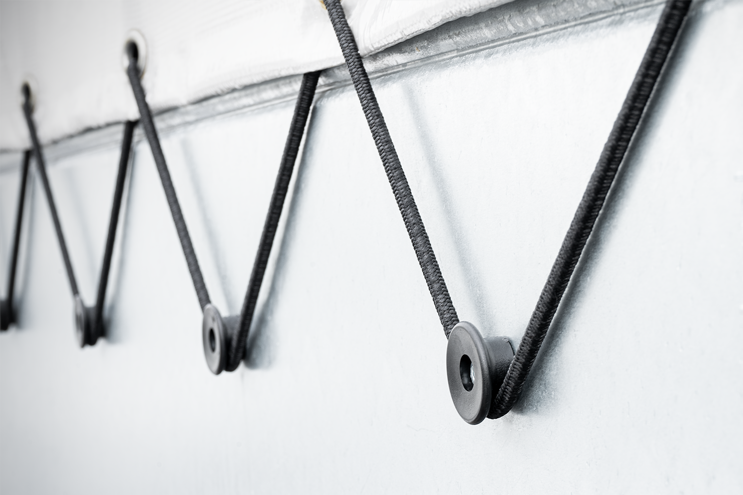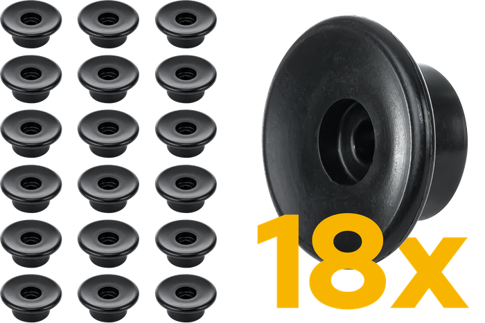 • Ein Set aus 18 Seitenwandrollen mit 30 mm Durchmesser für Autoanhänger und Lieferwagen. Zur Befestigung von Abdeckungen, Netzen und Planen an der Seitenwand mittels elastischer Seile.