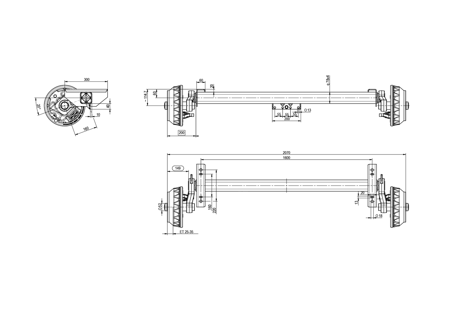 Die gebremste Achse des Herstellers KNOTT ist für schwere Anhänger oder Autotransporter mit einem zulässigen Gesamtgewicht von 1800 kg bei einer Einzelachse und 3500 kg bei einer Tandemachse vorgesehen. Die Auflage beträgt 1600 mm, die Anlage 2070 mm, was eine einfache Montage in einem breiten Fahrzeugbereich ermöglicht. Der Radanschluss von 5x112 sorgt für Kompatibilität mit einer großen Auswahl an am Markt verfügbaren Rädern. Die Schwinghebellänge beträgt 160 mm und sorgt für Stabilität und optimale Dämpfung, was die Fahrsicherheit auch bei voller Beladung erhöht.