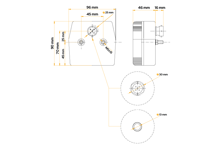 Die MD-002 Rückleuchte von FRISTOM ist für die Montage auf der linken und rechten Seite vorgesehen und zeichnet sich durch folgende Maße aus: Breite 96 mm, Höhe 90 mm, Tiefe 46 mm . Auf der Rückseite der Lampe befindet sich eine Gummitülle , die den Anschluss des Kabels erleichtert und sie somit ideal für den Einsatz in Anhängern und Transportern macht .