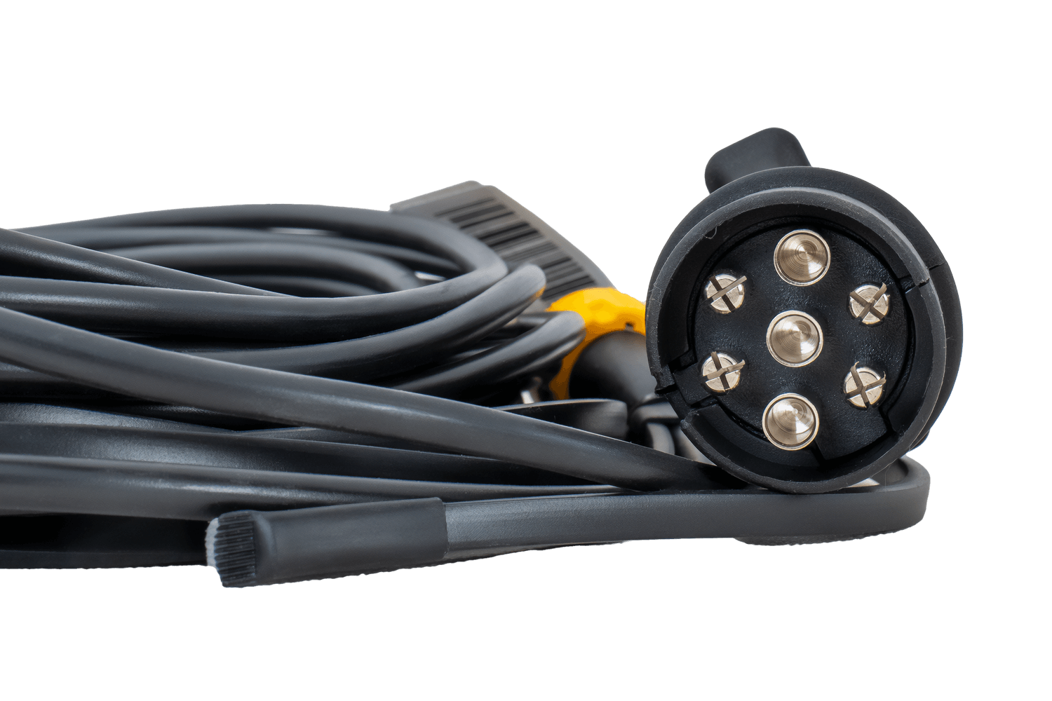 Der Kabelbaum ist mit zwei 5-poligen Bajonettsteckern zum Anschluss der Rücklichter ausgestattet. Das Bajonettsystem gewährleistet eine schnelle und sichere Installation und schließt das Risiko einer versehentlichen Trennung während der Fahrt aus. Die Konstruktion der Steckverbinder gewährleistet eine wasserdichte Verbindung und schützt die Kontakte vor Korrosion, was zu einem langfristigen, störungsfreien Betrieb der gesamten Anhängerbeleuchtungsanlage führt.