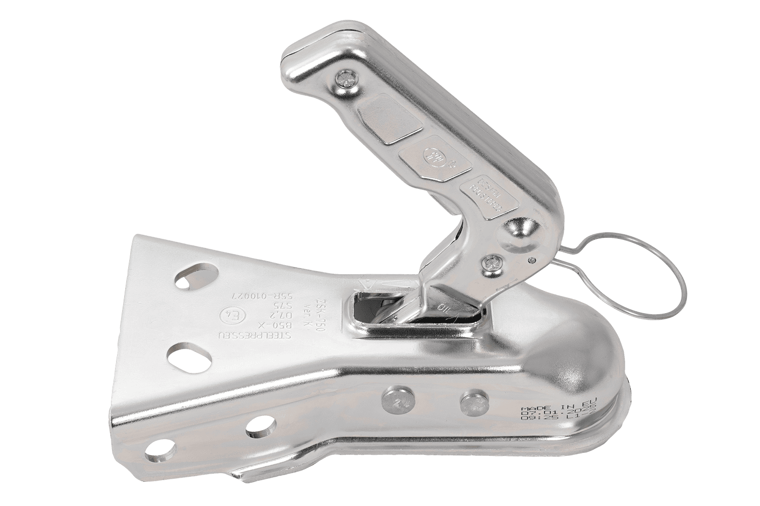 Der STEELPRESS- Kupplungskopf ist mit einem speziellen Verriegelungsbolzen ausgestattet, der ein versehentliches Lösen des Kupplungskopfes während der Fahrt verhindert und so für zusätzliche Transportsicherheit sorgt. Zusätzlich verfügt der STEELPRESS-Kupplungskopf über ein DEKRA-Zertifikat , das vom deutschen Kraftfahrzeug-Überwachungsamt ausgestellt wird. Dieses Zertifikat bestätigt, dass das Produkt detaillierten Tests unterzogen wurde und hohen Qualitäts- und Zuverlässigkeitsstandards entspricht.