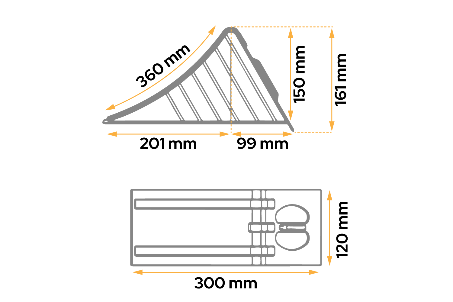 - Unterlegkeil von AL-KO, 161 mm hoch. Aus verzinktem Metall. Der Unterlegkeil kann mit Reifen mit einem Radius von bis zu 360 mm und einer maximalen Belastung von 1600 kg verwendet werden.