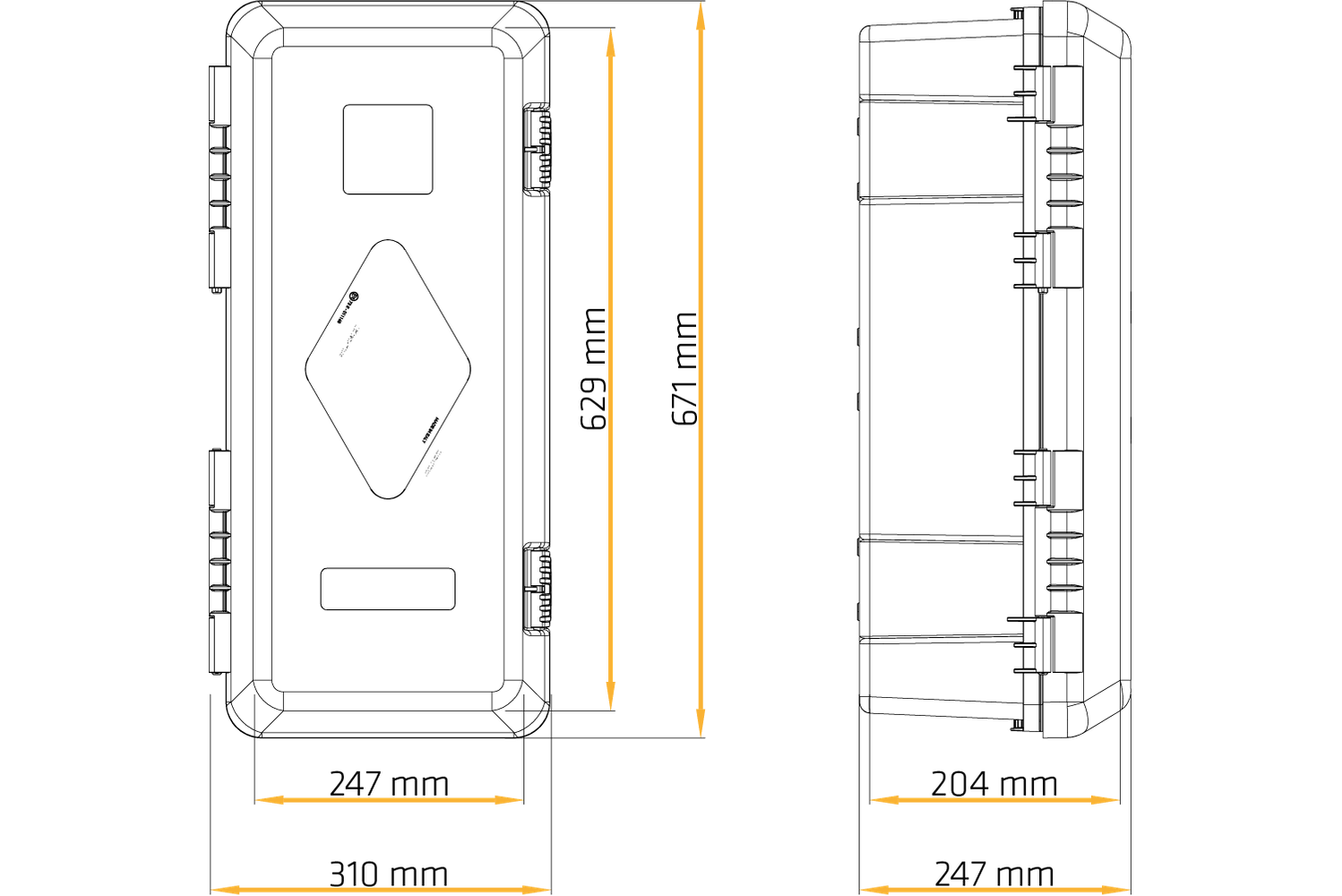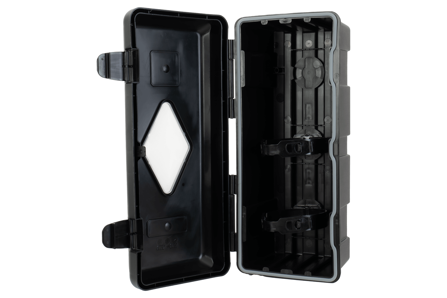 Die Feuerlöscherbox besteht aus hochwertigem Polypropylen, Nylon und Polycarbonat, was eine außergewöhnliche Haltbarkeit und Widerstandsfähigkeit gegen mechanische Beschädigungen gewährleistet. Diese Materialien bieten hervorragenden Schutz vor Feuer, Wasser, Staub, Kraftstoff, UV-Strahlen und extremen Temperaturen und machen die Box ideal für schwierige Betriebsbedingungen. Die solide Konstruktion schützt den Inhalt vor schädlichen äußeren Einflüssen, und das Sichtfenster ermöglicht eine schnelle Überprüfung des Feuerlöscherzustands und gewährleistet so Komfort und Sicherheit bei der Anwendung.