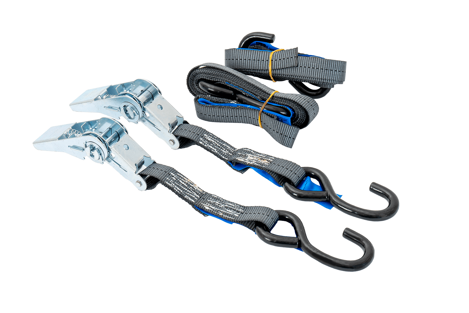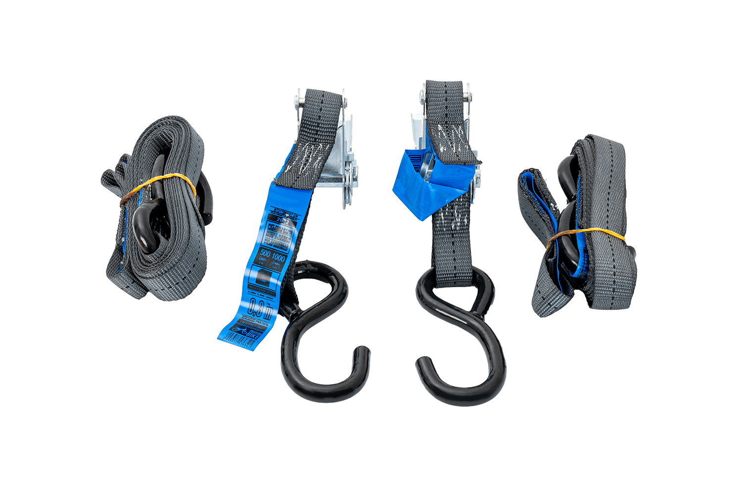 Set aus zwei HILLS 3m/25mm/1t Transportgurten mit Spanner und zwei 0,45m Gurten zur Sicherung des Motorrades
