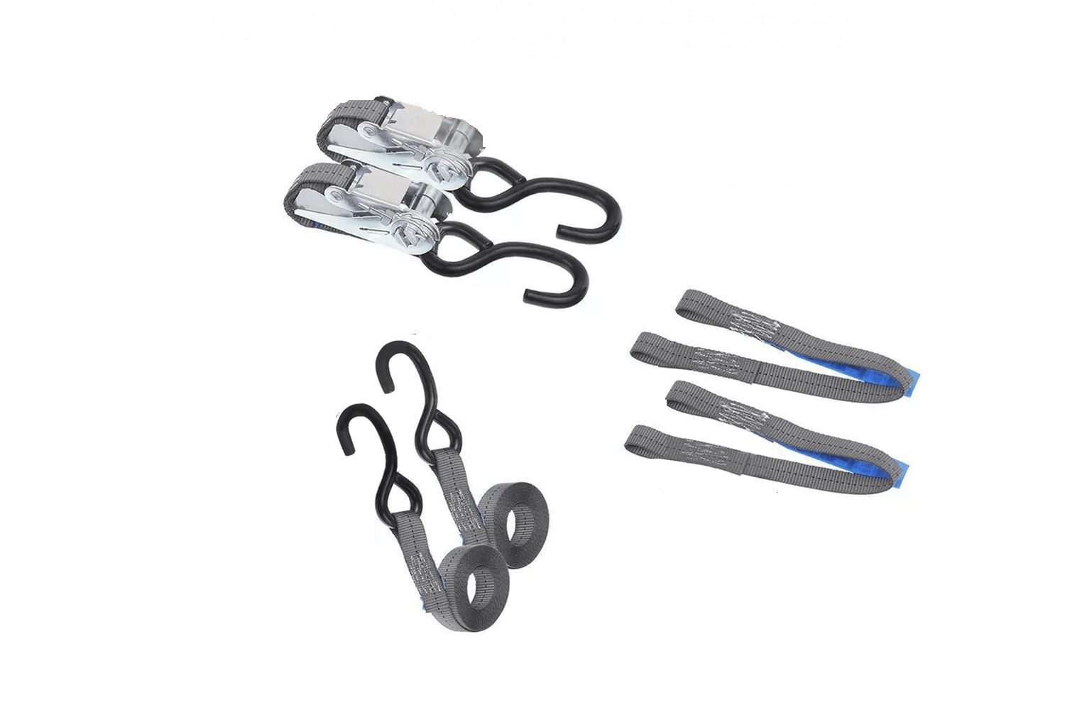 - Ein Set aus zwei Gurten und zwei Gurten zur Sicherung eines HILLS -Motorrads mit einer Tragfähigkeit von 1 Tonne. Die Gesamtlänge der Gurte mit Ratschen beträgt 3 Meter, die Gurte sind 0,45 Meter lang.
