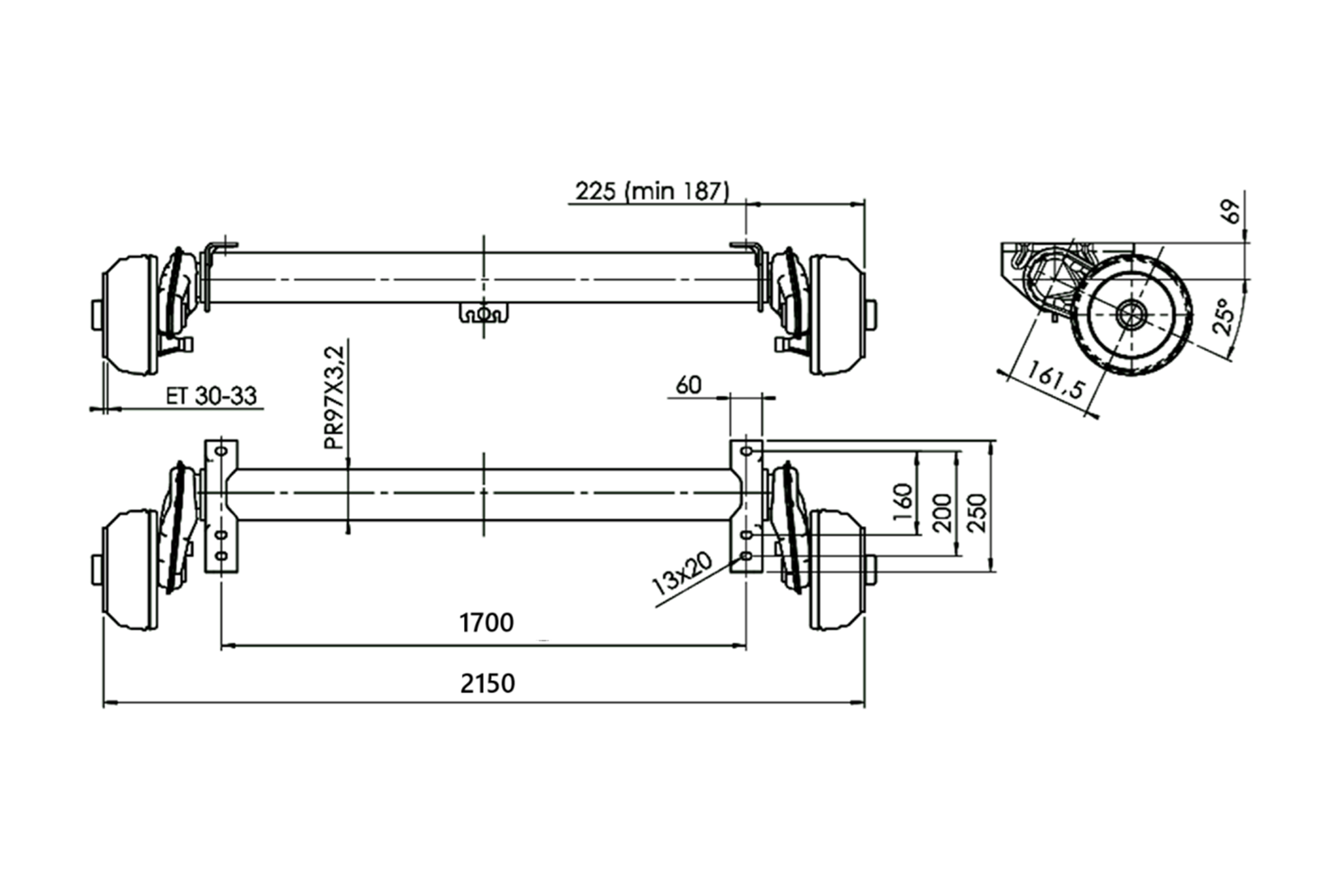 Die gebremste Achse des Herstellers AL-KO ist für die Anhänger oder Abschleppwagen mit einer maximalen Tragfähigkeit von 1.350 kg für eine Einzelachse und 2.700 kg für eine Tandemachse vorgesehen. Der Abstand der Befestigungslöcher beträgt 1700 mm, der Abstand der Naben 2150 mm , was einen einfachen Einbau in verschiedenste Fahrzeuge ermöglicht. Das 5x112-Lochmuster gewährleistet die Kompatibilität mit einer Vielzahl auf dem Markt erhältlicher Räder. Die Schwingenhebellänge beträgt 161,5 mm, was für Stabilität und optimale Stoßdämpfung sorgt und so die Fahrsicherheit auch bei voller Beladung erhöht.