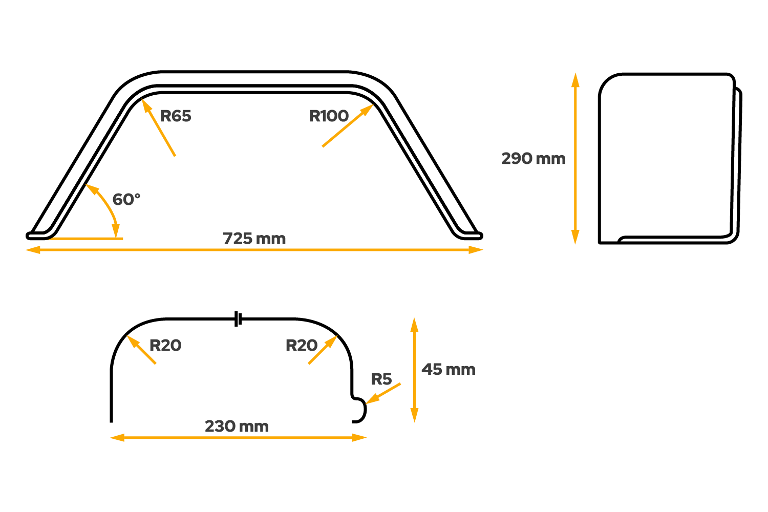 - Das für 13-Zoll-Räder konzipierte einzelne Metallschutzblech CHORUS ist 725 mm lang und 230 mm breit. Es schützt den Anhänger und seine Ladung vor mechanischen Beschädigungen und andere Verkehrsteilnehmer vor Schlamm- und Steinspritzern.