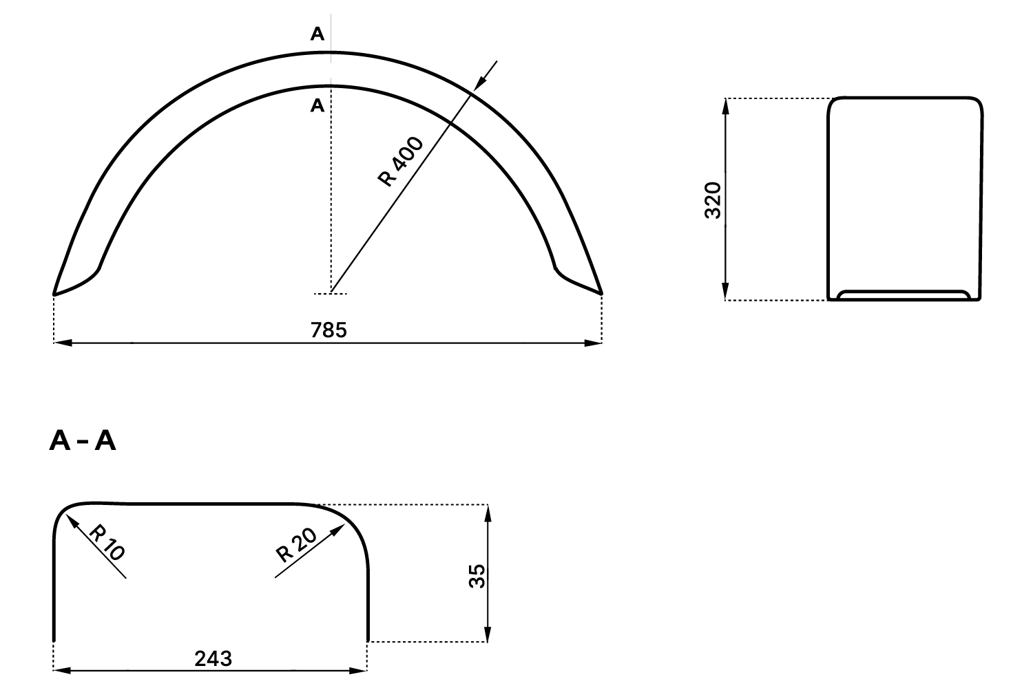 Der für 14-Zoll-Räder konzipierte Einzelkotflügel CHORUS ist ein zuverlässiges Ausstattungselement unter anderem für PKW-Anhänger. Seine Abmessungen betragen 785 mm Länge, 243 mm Breite und 320 mm Höhe . Der Kotflügel hat werkseitig keine Befestigungslöcher, was dem Benutzer die Freiheit gibt, die Befestigungspunkte an ein bestimmtes Fahrzeug anzupassen .
