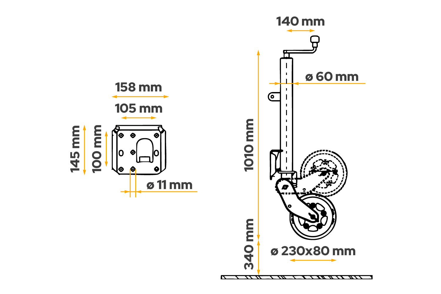 Das Stützrad AL-KO 1223638 ist mit einem Rohr mit einem Durchmesser von 60 mm und einer Gesamtlänge von 1010 mm einschließlich des Rades ausgestattet, was eine solide, stabile Konstruktion und komfortables Arbeiten auch bei einer höheren Zugstange gewährleistet.