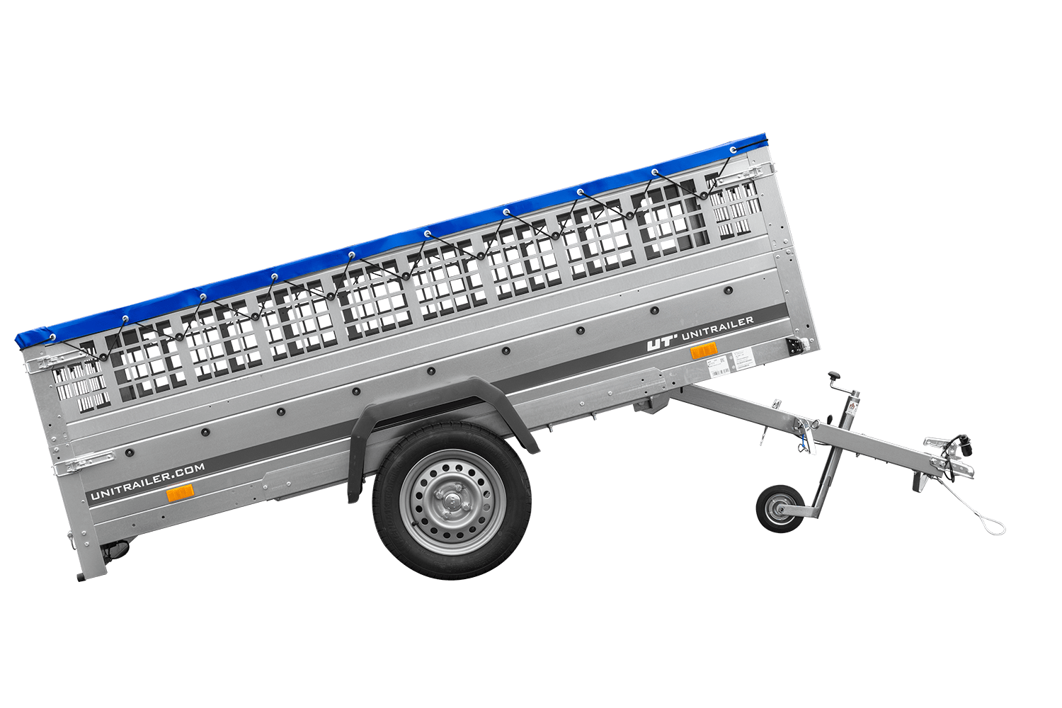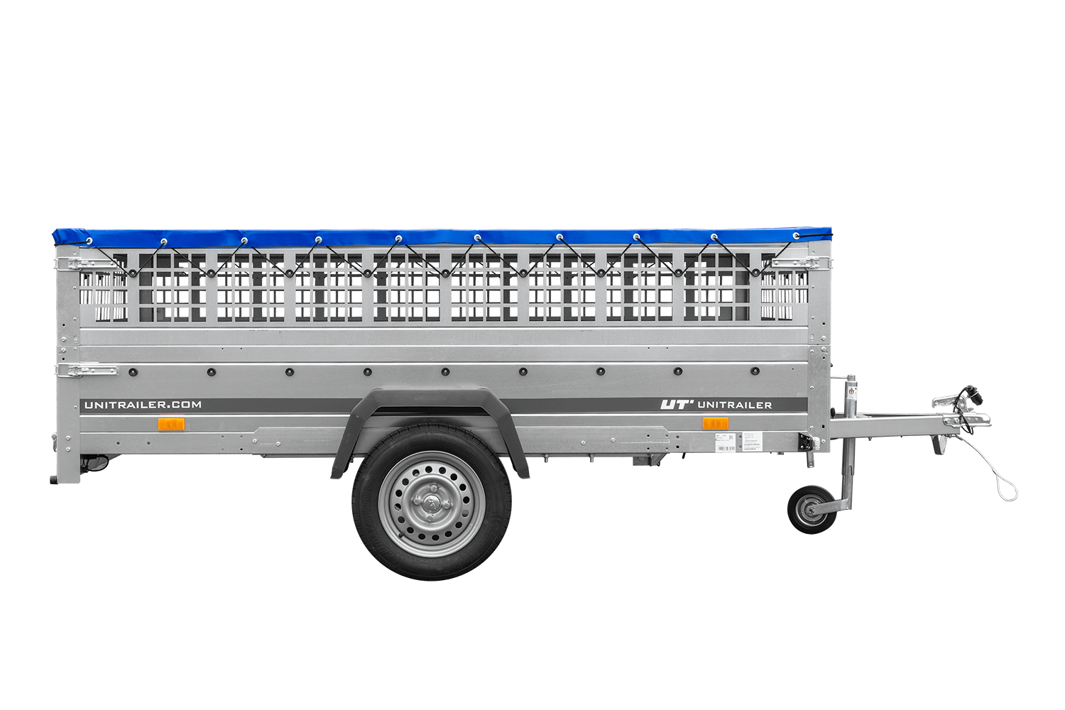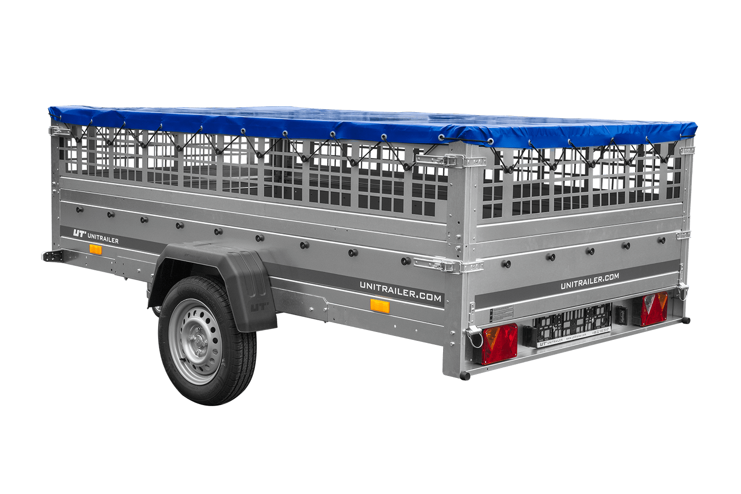 • UNITRAILER Garden 265 Kipp-PKW-Anhänger, 150 cm breit, komplett mit Gitteraufsatz, Flachplanenträgern und blauer Plane. Ein Anhänger, dank dem Ihre Waren vor schwierigen Wetterbedingungen geschützt sind.