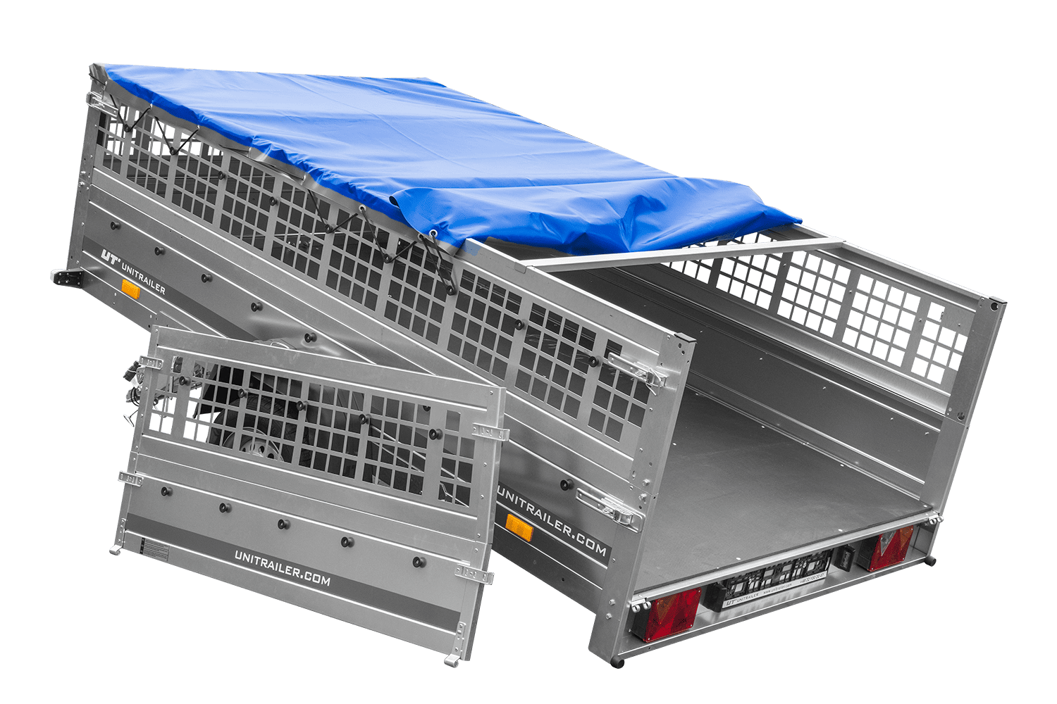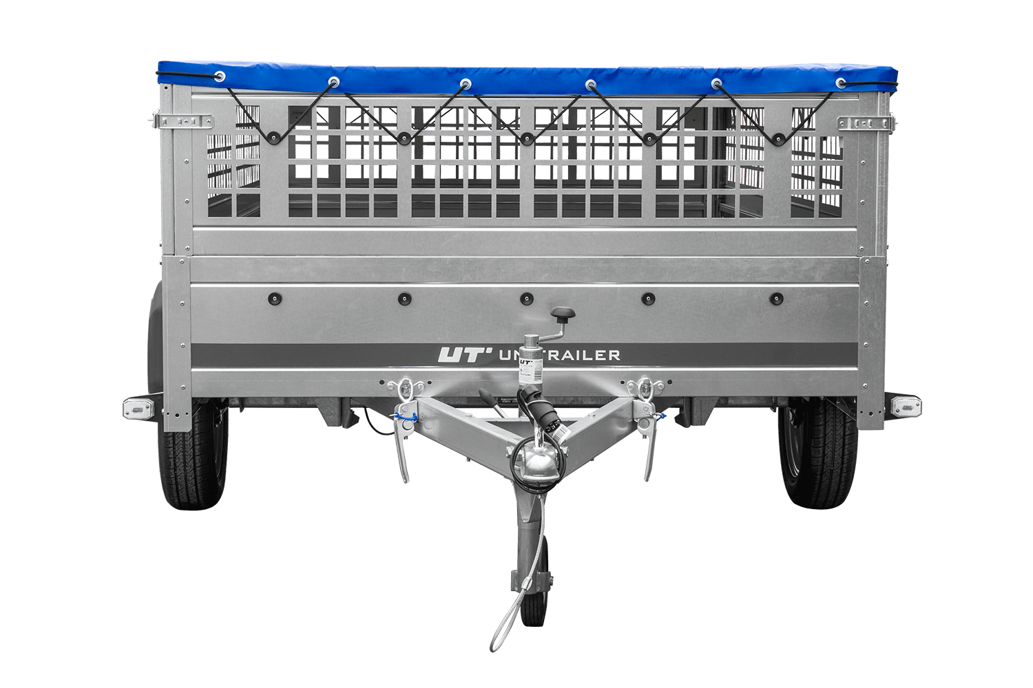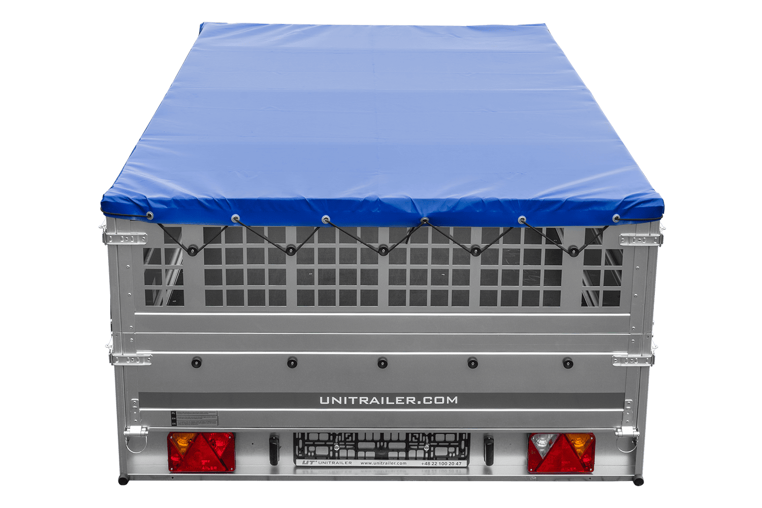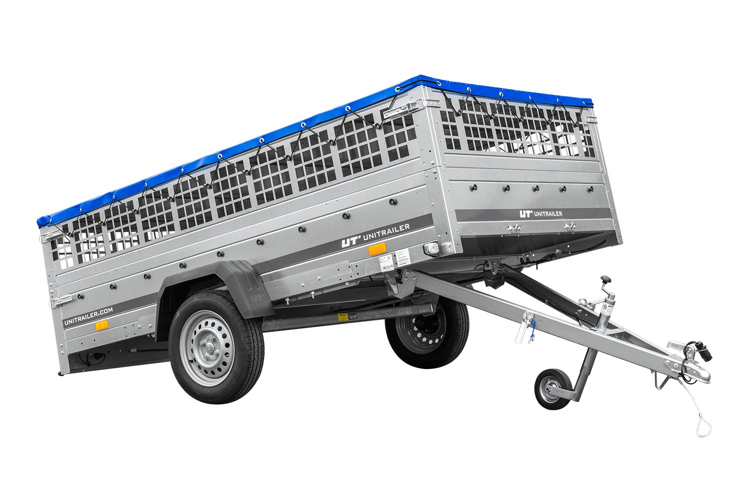 • UNITRAILER Garden 265 Kipp-PKW-Anhänger, 150 cm breit, komplett mit Gitteraufsatz, Flachplanenträgern und blauer Plane. Ein Anhänger, dank dem Ihre Waren vor schwierigen Wetterbedingungen geschützt sind.