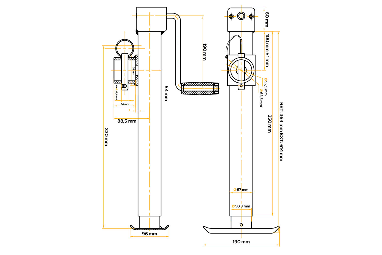 • Die Kurbelstütze TJ5001 hat eine maximale Tragkraft von 1300 kg und ist von 360 bis 614 mm verstellbar. Damit ist sie ideal für Landwirtschafts-, Bau- und Transportanhänger. Sie sorgt für Stabilität im geparkten Zustand und schützt das Fahrzeug vor Überla