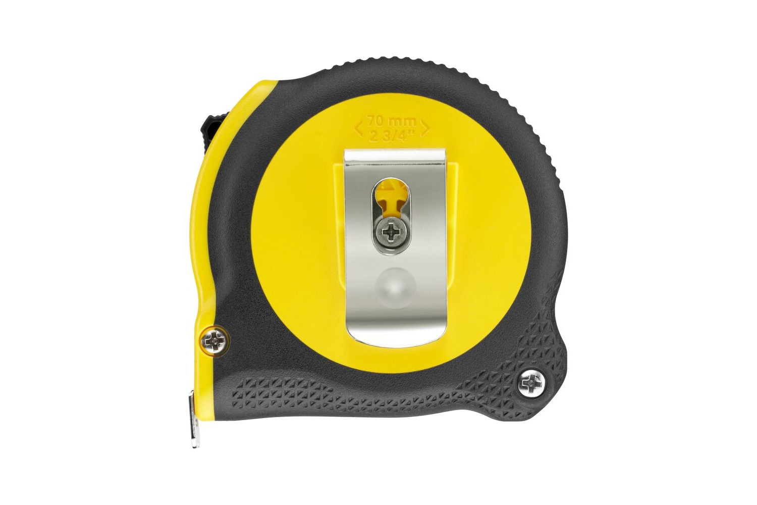 Das ergonomische Kunststoffgehäuse liegt gut in der Hand und garantiert auch bei intensiver Arbeit einen angenehmen Bedienkomfort. Das Maßband verfügt über einen Haken, der das Messen durch eine Person erleichtert, und eine Bandsperre , die das Band während des Ablesens stabilisiert . Dieses praktische und langlebige Werkzeug wird sich sowohl auf der Baustelle als auch in der Heimwerkstatt als nützlich erweisen.