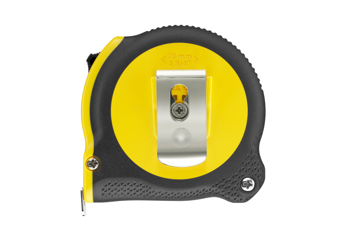 Das ergonomische Kunststoffgehäuse liegt gut in der Hand und garantiert auch bei intensiver Arbeit einen angenehmen Bedienkomfort. Das Maßband verfügt über einen Haken, der das Messen durch eine Person erleichtert, und eine Bandsperre , die das Band während des Ablesens stabilisiert . Dieses praktische und langlebige Werkzeug wird sich sowohl auf der Baustelle als auch in der Heimwerkstatt als nützlich erweisen.
