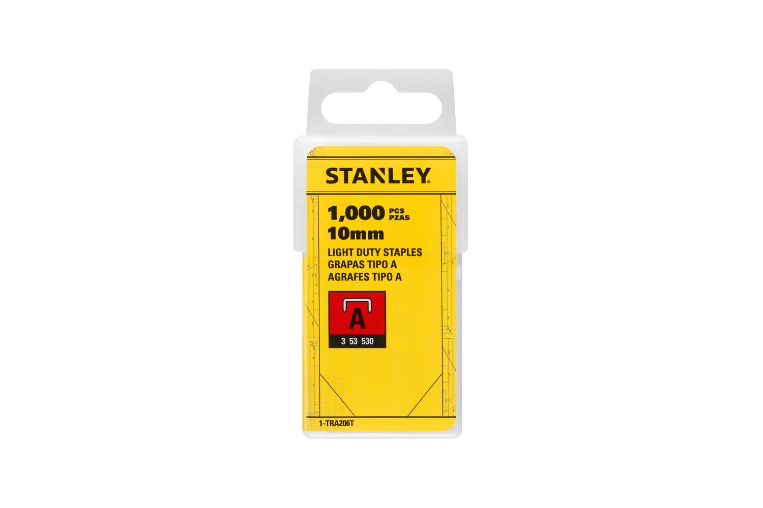 - Die Stanley 1-TRA206T Stahlklammern (Typ A, 3/53/530, 10 mm) sind ein robustes Zubehör zum Befestigen von Stoffen, Folien und Geweben. Sie sind aus verzinktem Stahl gefertigt und korrosionsbeständig. Das 1000-teilige Set wird in einem Schutzkoffer geliefe