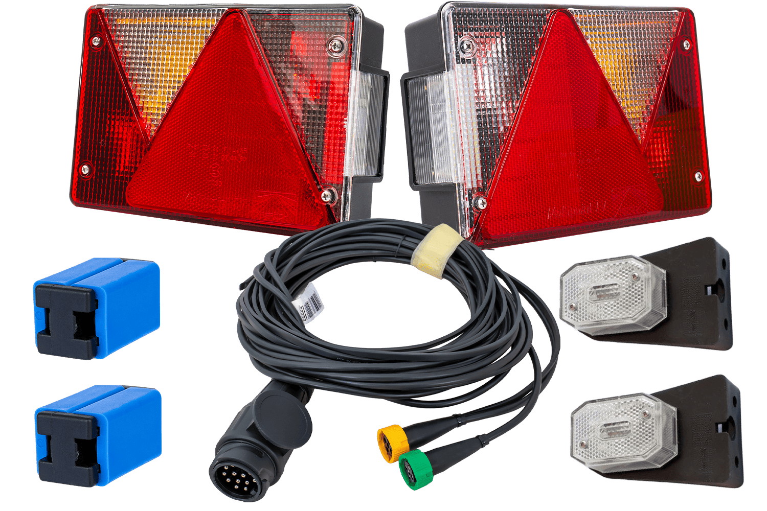 Das Beleuchtungsset ist eine umfassende Elektroinstallation , die Anhänger, Auflieger und andere Transportfahrzeuge vollständig und vorschriftsmäßig beleuchtet und so deren Sichtbarkeit und Verkehrssicherheit erhöht. Es besteht aus Rückleuchten, Begrenzungsleuchten, einem Kabelbaum und Schnellverbindern. Die Schnellverbinder ermöglichen eine schnelle und einfache Montage und sorgen für eine dauerhafte und sichere Verbindung zwischen Begrenzungsleuchten und Verkabelung. Dank hochwertiger Komponenten garantiert das Set einen zuverlässigen Betrieb und gute Sichtbarkeit. und Einhaltung der geltenden Sicherheitsstandards. Dies ist die ideale Lösung für alle, die ein umfassendes und langlebiges Fahrzeugbeleuchtungssystem suchen .