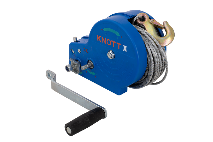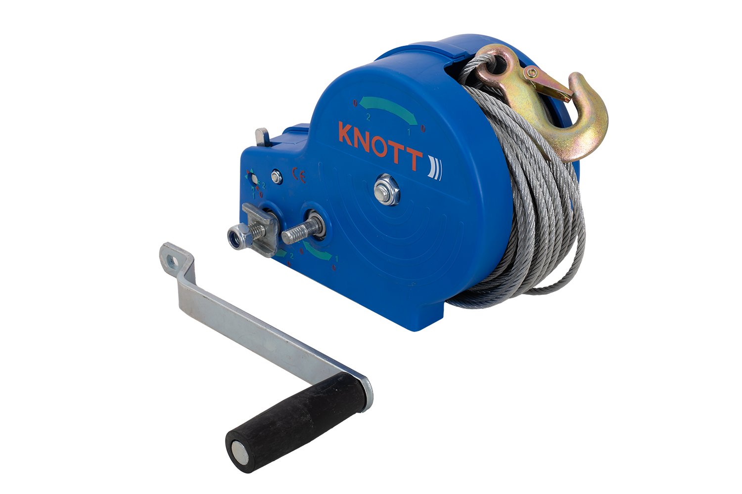Die Knott-Handkurbelwinde mit einer maximalen Zugkraft von 1135 kg ist primär für Boots- und Pritschenanhänger konzipiert. Sie besteht aus einem Gehäuse, einer aufschraubbaren Kurbel und einem ca. 7 Meter langen Seil mit einem robusten Haken. Die Winde verfügt über zwei Übersetzungsverhältnisse.