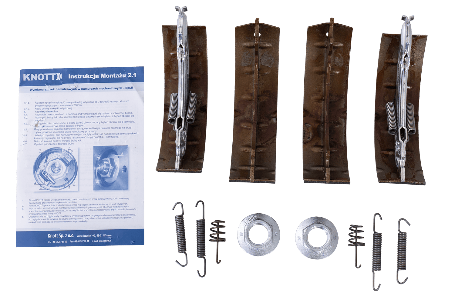 Der Bremsbackensatz KNOTT 47276S ist ein kompletter Originalsatz für Bremssysteme mit 200 x 50 mm großen Trommeln, die in Anhängern mit Achsen mit einer zulässigen Last von 1350 bis 1500 kg verwendet werden. Das Kit ist für die komplette Regeneration der Bremse einer Achse konzipiert, inklusive aller notwendigen Befestigungselemente.