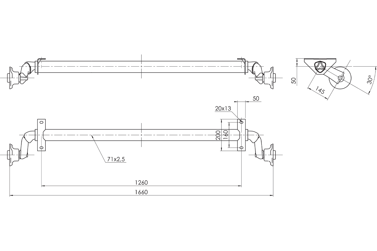 - AL-KO OPTIMA ungebremste Anhängerachse mit einer maximalen Tragfähigkeit von 750 kg. Der Lochabstand beträgt 1260 mm, der Nabenabstand 1660 mm und das Lochbild 4x100. Die Schwingarmlänge beträgt 145 mm.