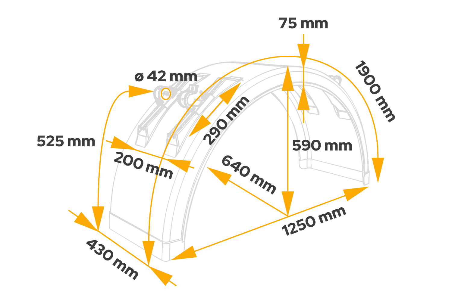 Der für Räder mit einem Durchmesser von 19,5 bis 22,5 Zoll konzipierte DOMAR-Einzelkotflügel DK2975 ist ein zuverlässiges Ausstattungselement unter anderem für Sattelauflieger und LKW-Anhänger mit Einzelrädern sowie für einige Bau- und Landmaschinen entsprechender Abmessungen. Seine Abmessungen betragen 1250 mm Länge, 430 mm Breite und 590 mm Höhe . Der Kotflügel ist mit integrierten, verstellbaren Befestigungshalterungen mit einem Durchmesser von 42 mm ausgestattet, die eine flexible Anpassung an verschiedene Fahrzeugmodelle ermöglichen. Die Halterungen verfügen über Gummipads, die für besseren Halt und Vibrationsdämpfung sorgen.