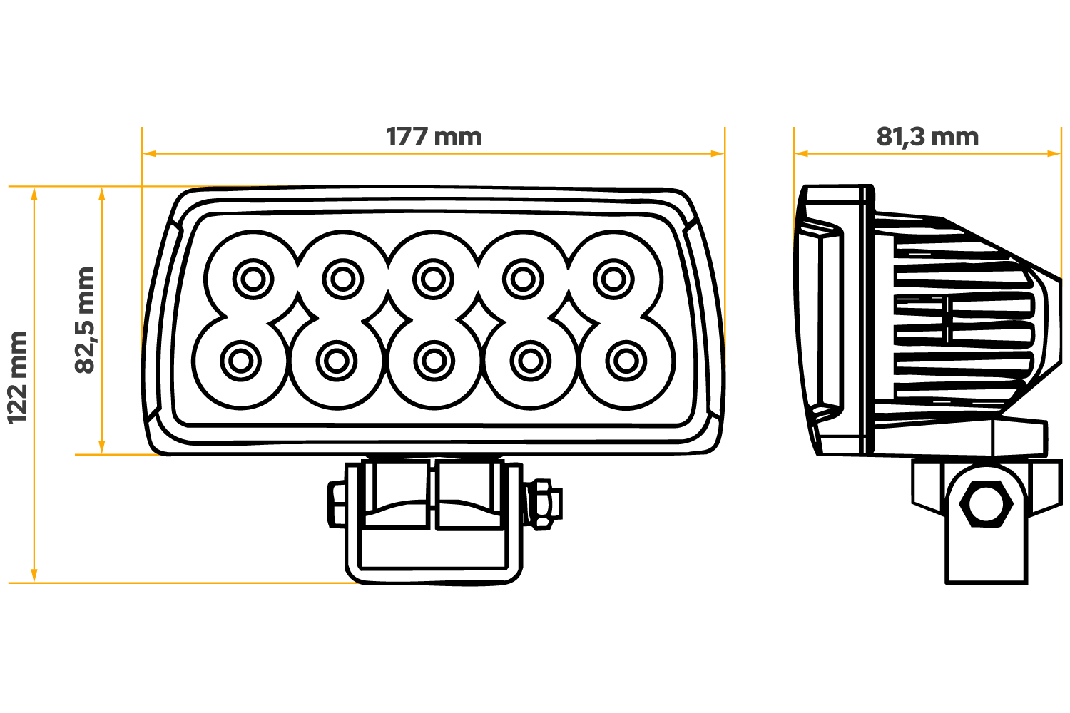 Die Lampe zeichnet sich durch eine hohe Widerstandsfähigkeit gegen Stöße, Vibrationen und extreme Temperaturen von -40°C bis +80°C aus, was ihren zuverlässigen Betrieb auch unter schwierigen Arbeitsbedingungen gewährleistet. Der einstellbare Abstrahlwinkel ermöglicht eine präzise Ausrichtung des Lichtstrahls, minimiert das Risiko, andere Verkehrsteilnehmer zu blenden und erhöht somit den Arbeitskomfort und die Sicherheit. Darüber hinaus erfüllt die Lampe die Anforderungen des Standards CISPR 25 Klasse 4 , was eine hohe Effizienz bei der Reduzierung elektromagnetischer Störungen bedeutet, sodass sie den Betrieb anderer elektronischer Geräte im Fahrzeug nicht stört und sicher in modernen Maschinen mit empfindlicher Elektronik verwendet werden kann.