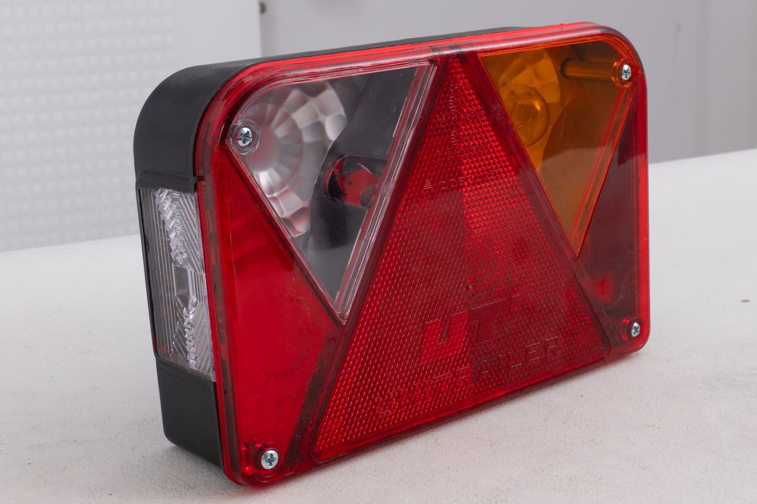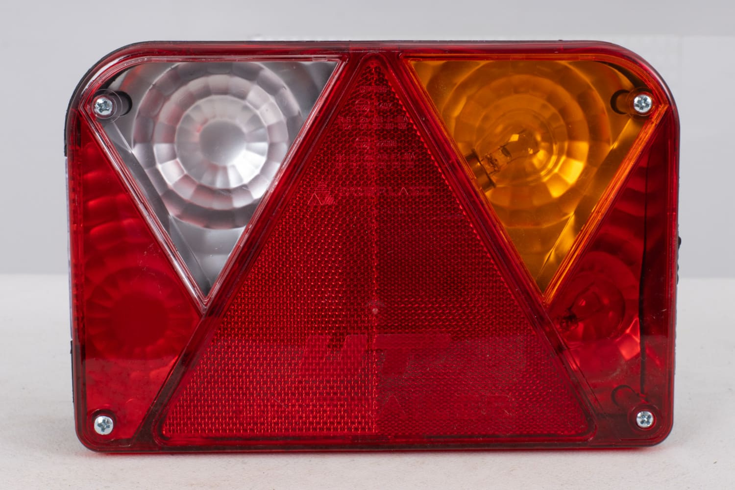 Die Lampe hat fünf Funktionen: ein Positionslicht , das die Sichtbarkeit des Fahrzeugs bei Nachtfahrten gewährleistet; Blinker , mit dem Sie Ihre Abbiegeabsicht anzeigen können ; ein Bremslicht , das das Bremsen signalisiert ; eine Kennzeichenbeleuchtung , die die Sichtbarkeit des Fahrzeugkennzeichens bei Nacht gewährleistet ; und ein reflektierendes Dreieck , das die Sichtbarkeit des Fahrzeugs erhöht .