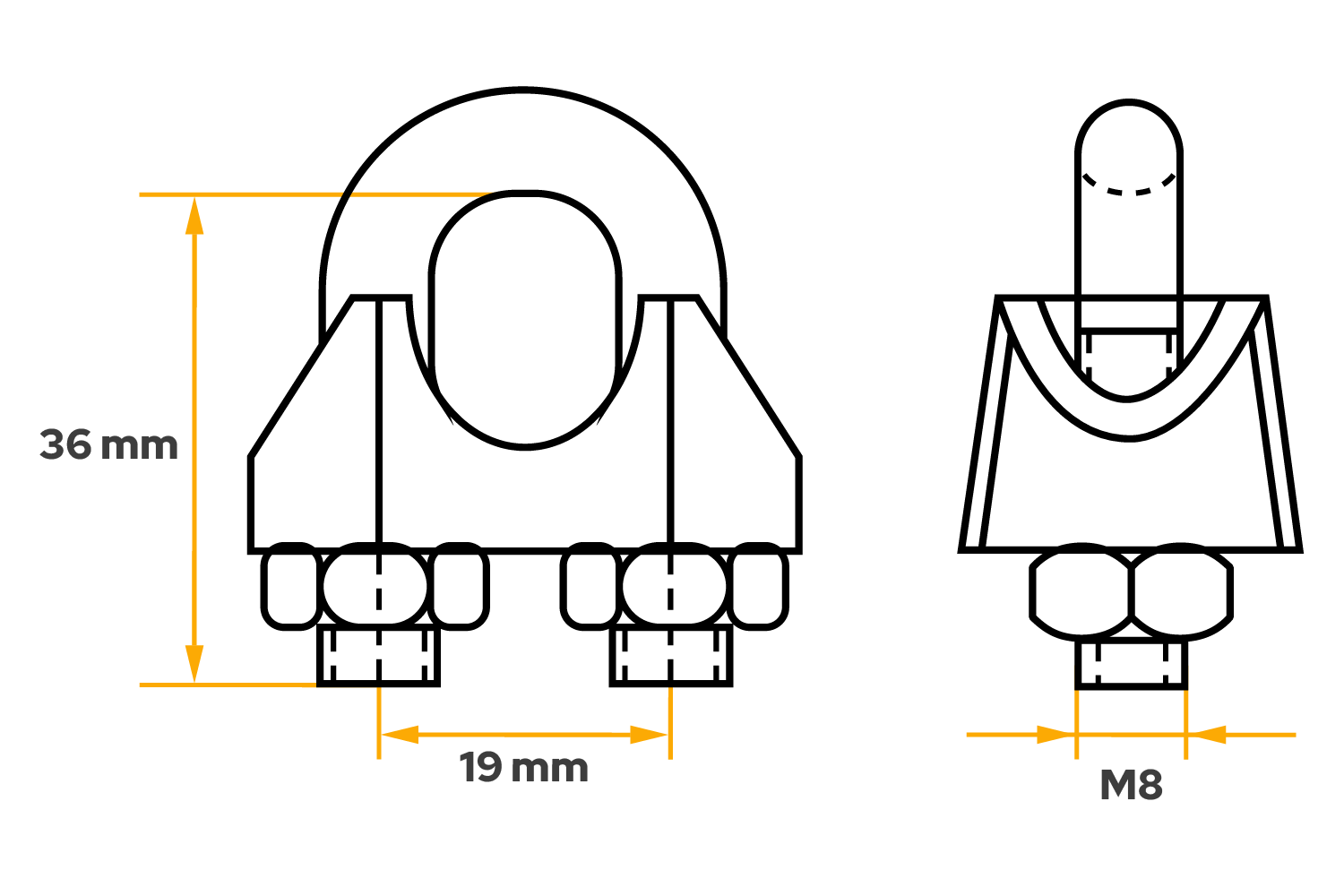 - Die DROMET-Seilklemme ZL10 verfügt über ein M8-Gewinde und eine Höhe von 41 mm. Sie ist zum Klemmen von Stahlseilen mit einem Durchmesser von 10 mm ausgelegt. Sie dient zum sicheren Verbinden, Bilden von Schlaufen und Fixieren von Stahlseilen.