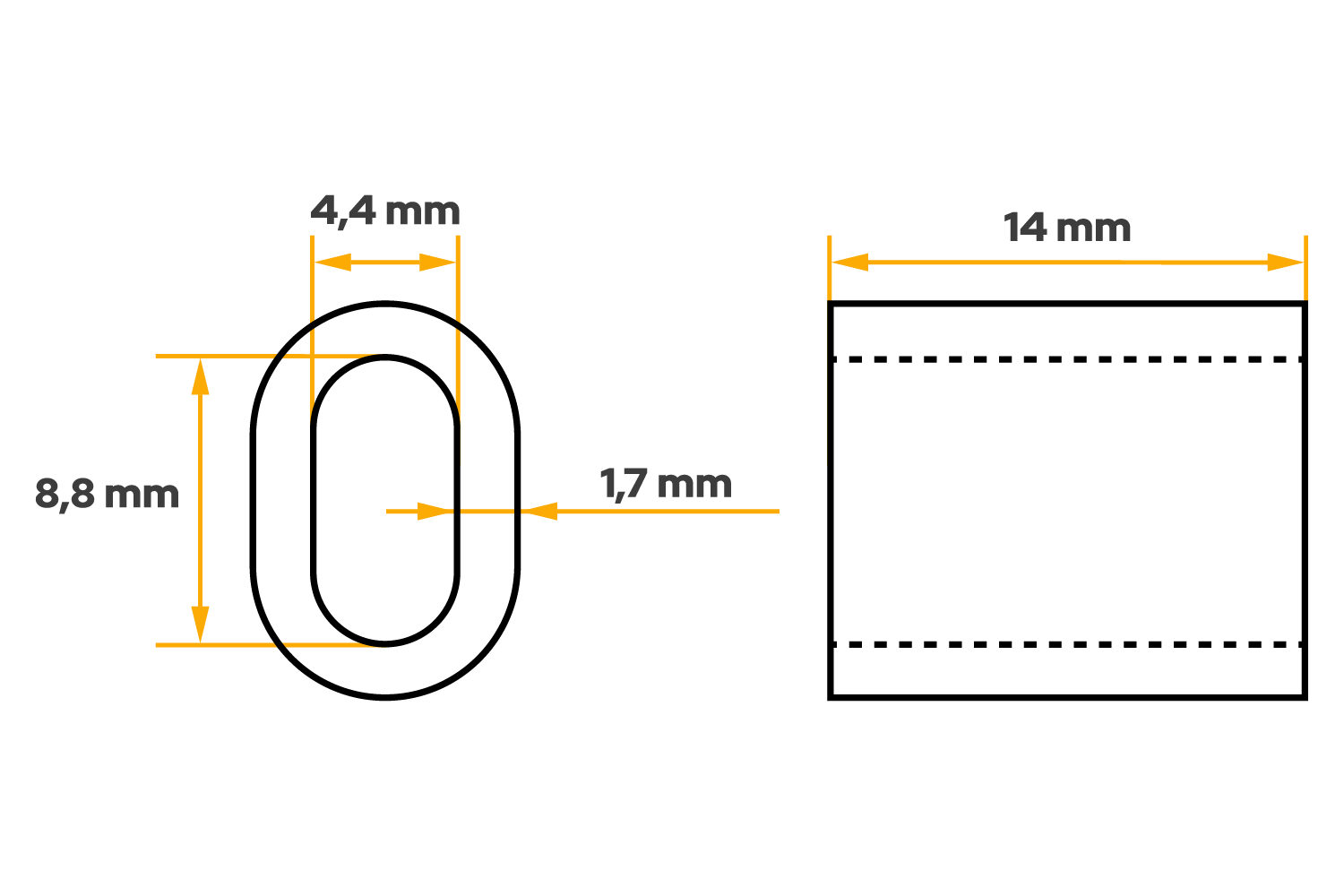 Der Seilpressklemme ZLA.4 von DROMET ist zum Klemmen von Stahlseilen mit einem Durchmesser von 4 mm konzipiert. Das Produkt hat Hülseninnenmaße von 4,4 × 8,8 mm und eine Gesamtlänge von 14 mm , was eine präzise und dauerhafte Platzierung des Seils ermöglicht. Er wird hauptsächlich bei der Herstellung von Seilschlingen eingesetzt und ermöglicht die effektive Herstellung von Schlaufen und Verbindungen in Befestigungssystemen.