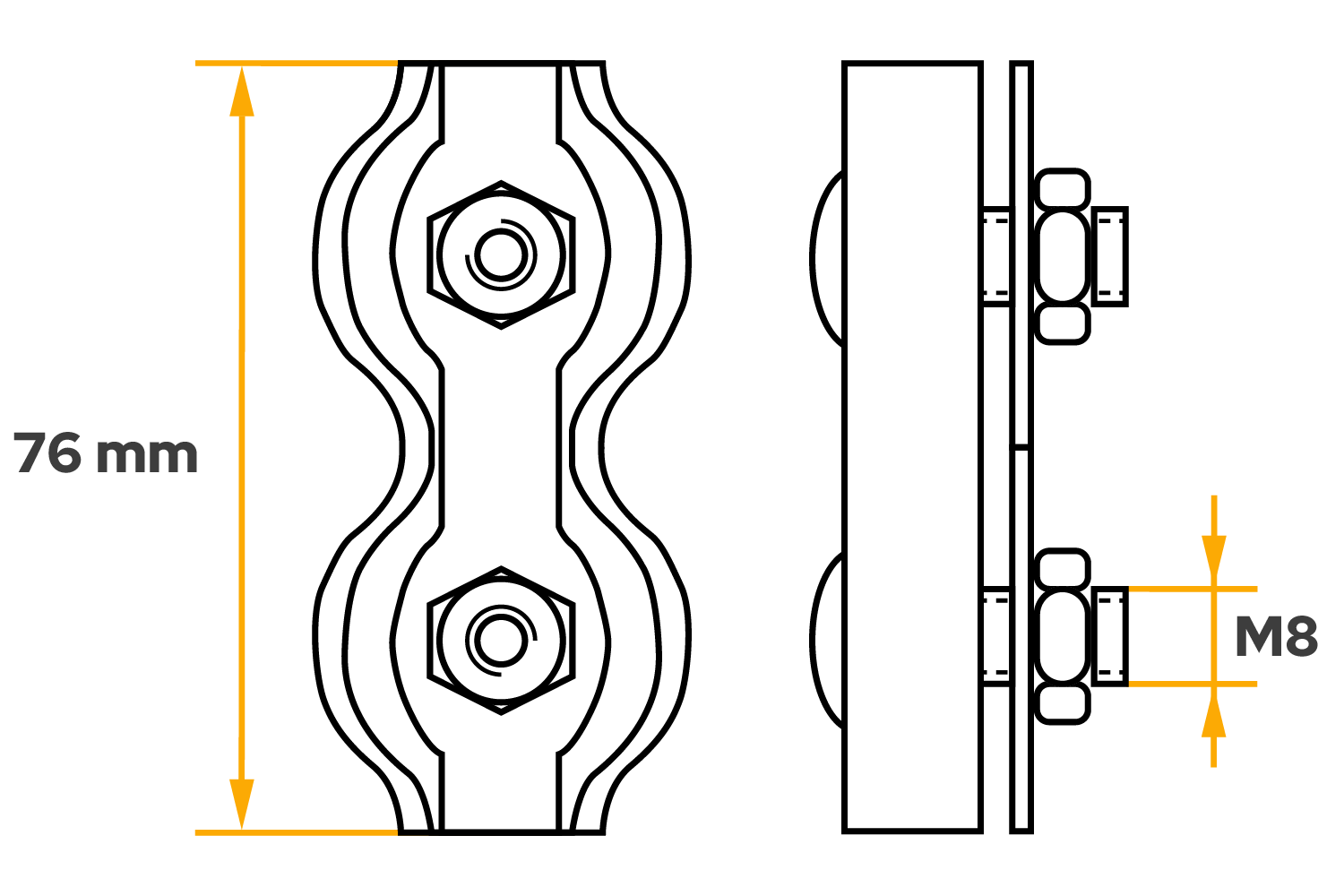 - Duplexklemme ZLS.8 DROMET für 8 mm Stahlseile, mit M8-Gewinde und 76 mm Länge. Aus verzinktem Stahl, korrosionsbeständig. Sorgt für eine stabile, gleichmäßige Seilbefestigung. Einsatz im Baugewerbe, Transportwesen, Gartenbau und Segelsport.