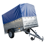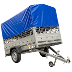 Planenanhänger 230x125 Garden Trailer 230 KIPP mit Laubgitteraufsatz, blauer Hochplane, Hochspriegel und Stützrad